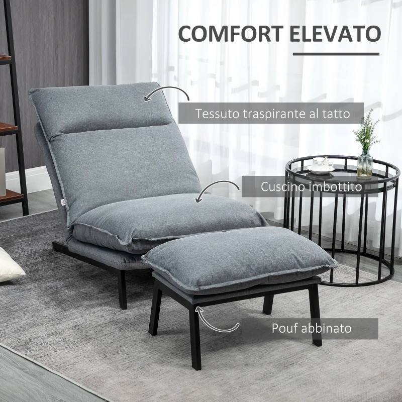 HOMCOM Poltrona Relax Reclinabile a 4 Livelli con Pouf Poggiapiedi in Tessuto Grigio Chiaro. Poltrona relax in tessuto, che unisce una struttura un metallo dall'aspetto minimalista a un rivestimento semplice con eleganti cuciture. SCHIENALE REGOLABILE: Sdraiati e rilassati in ogni momento. La poltrona reclinabile su 4 posizioni si regola a 90°, 120°, 145°, 180°, livelli perfetti per soddisfare ogni tua esigenza di relax. MASSIMO COMFORT: Il design senza braccioli rende la seduta ampia, mentre il tessuto effetto lino traspirante e l'abbondante imbottitura assicurano un comfort elevato. Il pouf poggiapiedi abbinato a questa poltrona moderna ti permette di raggiungere un relax completo. SOLIDITÀ: Il telaio in acciaio della poltrona per soggiorno è solido e stabile, e la base è dotata di piedini per proteggere il pavimento dai segni. DIMENSIONI: Dimensioni generali: 74L x 100P x 94Acm (poltrona), Capacità di peso: 160kg (poltrona), 150kg (pouf).