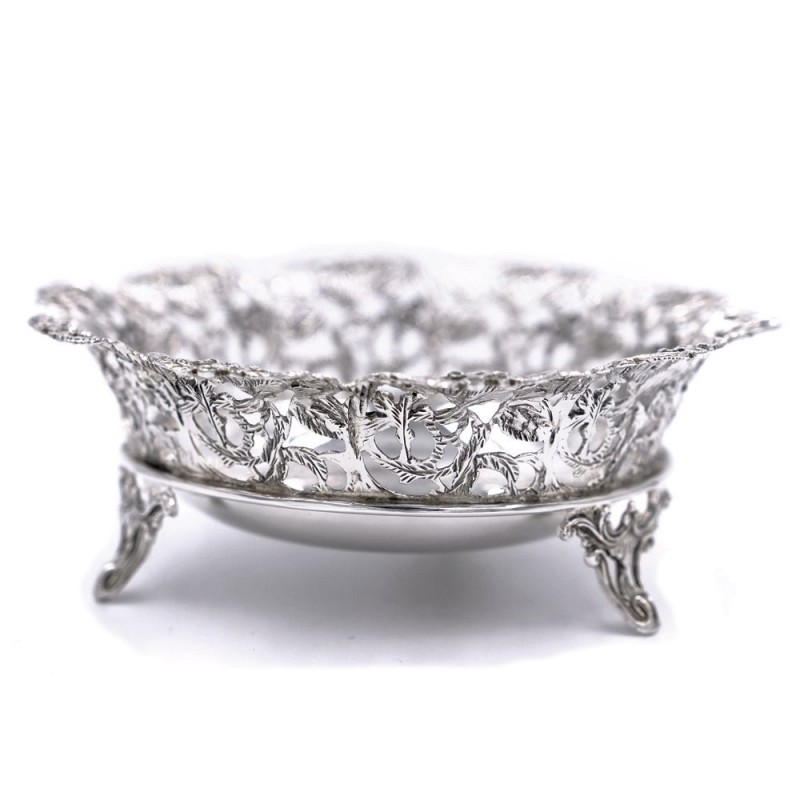 Cestello Tondo in Argento 925 modello lucido con piedini e fine decoro con foglie in microfusione by Benvenuti Argenti. Pregiato pezzo d'argenteria prodotto da artigiani della scuola fiorentina. Il diametro del cestello misura cm 13,5 e l'altezza è di cm 5. Il peso del prodotto è di 147 gr. I piedini ed il bordo esterno sono in argento microfuso finemente decorati. L'alta qualità dei materiali e della lavorazione sono garantiti dai marchi legali impressi sul pezzo.