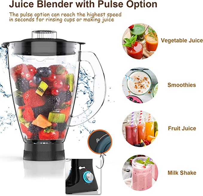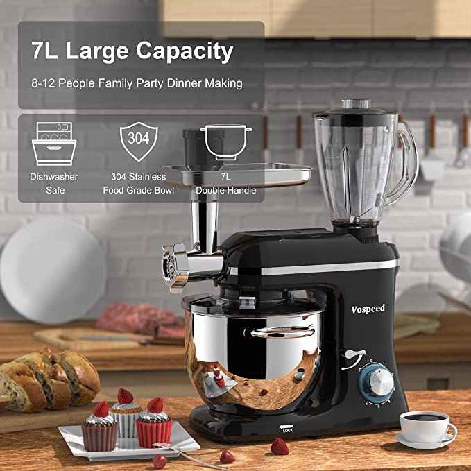 9 in 1 Mixer Multifunzione 1500W - Robot da Cucina con Ciotola di Acciaio Inossidabile - 8Qt e 6 velocità - Frullatore, Tritacarne, Rullo per Impasto - Miscelatore professionale da 1,5 litri e tritacarne - Grande capacità da 8Qt - 3 accessori (gancio per il pane, frusta per dolci, frusta) - Accessori realizzati in acciaio inossidabile, lavabili in lavastoviglie - Impastatrice con motore in rame puro da 1500 watt alla massima potenza - Tritacarne elettrico veloce, facile e pratico - Grazie al sensore integrato si spegne automaticamente in caso di surriscaldamento - Basso rumore, 60 decibel - Il mixer è dotato di piedinatura antiscivolo, così da restare ben saldo sul pianale della cucina, senza alcun spostamento mentre è in funzione.