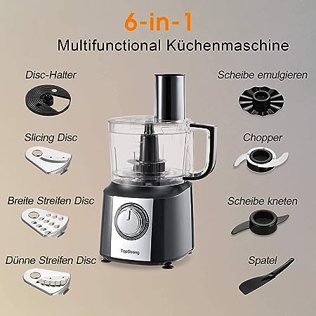 Robot da cucina multifunzione 6 in 1: integrazione delle sei funzioni come taglio a fette, taglio a filo sottile, taglio a filo grosso, tritatutto, impastare e sbattere le uova. Con questo processore avrai un buon aiutante che ti farà risparmiare tempo di cottura e avere più tempo per riposare. 7 accessori multifunzionali: disco 3 in 1 che può tagliare fette, fare tagli con il filo sottile o il filo grosso, il che permette di rimuovere e di sostituire facilmente diversi coltelli. Un coltello può sminuzzare rapidamente il cibo e tagliare un piatto di carne o cipolla in dieci secondi. Con il disco impastatore non avrete più bisogno di impastare con le mani. Il disco emulsionante mescola rapidamente uova o panna. Design sicuro: il design a doppio blocco garantisce la sicurezza del processo di utilizzo. Ci sono 4 piedini con ventose sul fondo, in modo che il robot da cucina possa restare sul piano del tavolo e non sia soggetto a scosse durante l'uso. Interruttore a manopola facile da usare: ruota l'interruttore a manopola selezionando 1 o 2. Il pulsante “P” è per la funzione “pulse”, quando lo rilasci, l'interruttore a manopola torna automaticamente su 0. La funzione si interrompe e l’elettrodomestico si ferma automaticamente. Questo robot da cucina ha un buon rapporto qualità/prezzo e può lavorare diversi ingredienti in modo rapido e uniforme, in modo da poterli utilizzare praticamente per ogni piatto. Robot da cucina compatto: dimensioni del prodotto: 25 x 17,5 x 39 cm, le dimensioni ridotte fanno sì che il prodotto non occupi molto spazio nella tua cucina. Il processore alimentare da 2 l non è né troppo grande né troppo piccolo ed è l’ideale per le esigenze della maggior parte delle famiglie.