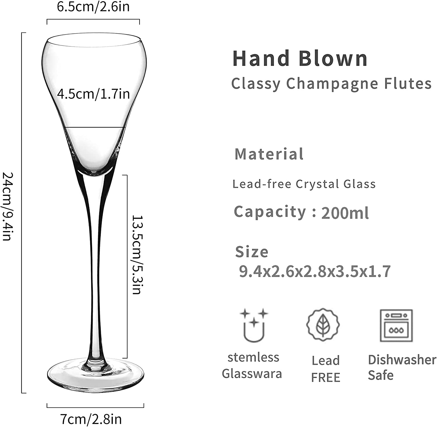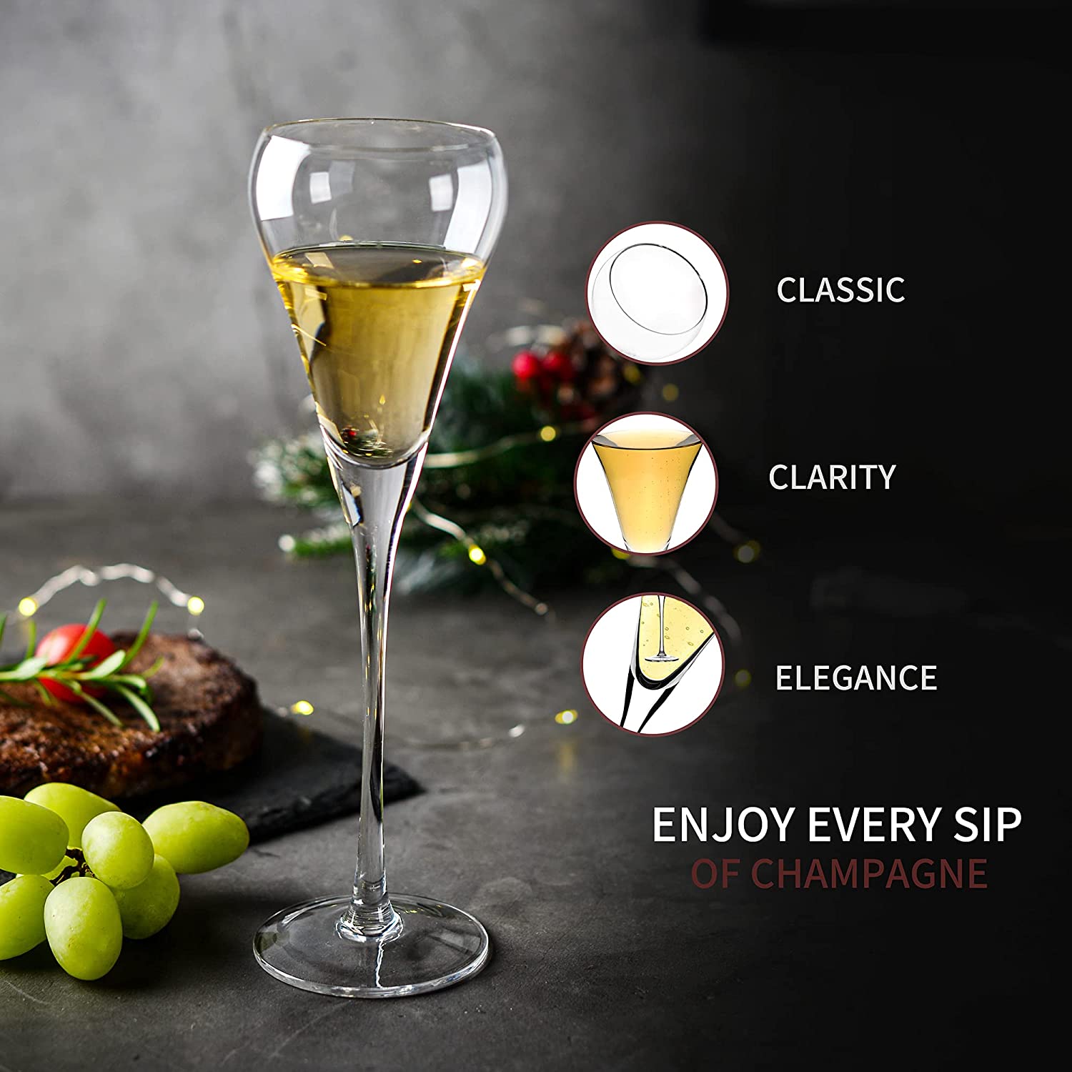 6 Flute in Cristallo Trasparente 100% Senza Piombo. Il flute da champagne è realizzato in vetro di cristallo super trasparente senza piombo, è termoregolato, resistente, con le caratteristiche di anti-caduta, infrangibile e ad alta trasparenza. Il bordo del flute da champagne Amisglass è delicato e delicato, in grado di catturare completamente le caratteristiche gassate dello champagne, ridurre la superficie, soffiare via le microscopiche bolle di carbonato e migliorare il sapore dello spumante. Il rapporto corpo-gambo è ragionevole ed è comodo da tenere, il che può tenere le mani lontane dal vino. Il fondo tondo rende il flute più stabile.