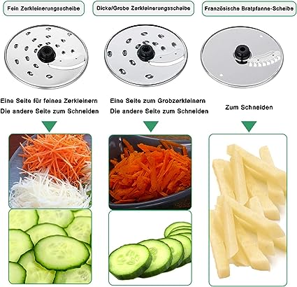 Robot da Cucina Multifunzione:11 in1 funzione, perfetta per tagliare, mescolare, tritare, grattugiare, succo, affettare, mescolare e fare l'impasto, può essere usata come fresatrice vegetale, frullatore, elicottero, multi mixer, tritacarne, macina caffè, spremere e baby food, la vostra grande mano cucina. Mixer di Cibi Professionali: Motore potente 1100 watt con le impostazioni di velocità e la funzione di impulso, operazione super veloce, ci vogliono solo pochi secondi per elaborare una vasta gamma di materiali alimentari, accelerare il tempo di pasto. Elevata Capacità Robot Cucina: BPA-free 3.2L grande ciotola con fino a 2L capacità di lavoro e 1.5L frullatore barattolo, può contenere una grande quantità di ingredienti, la scelta migliore per preparare grandi pasti e grande cena in famiglia. Facile da pulire Robot da Cucina: con coperchio di chiusura di sicurezza e piedi antiscivolo per operazioni sicure.