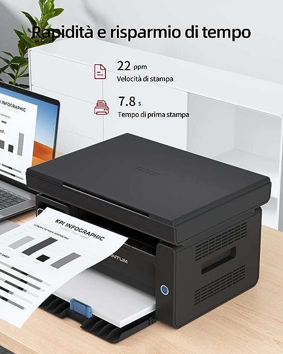 Velocissima: velocità di stampa fino a 22 pagine al minuto,USB2.0 + Wi-Fi. Stampa solo in bianco e nero, stampa fronte e retro manuale, Effettua scansioni e fotocopie, scansione fronte e retro manuale. Installazione del driver in un solo passaggio con facile configurazione Wi-Fi. Stampa in modo wireless dal Suo laptop e tablet, e stampa mobile dal dispositivo mobile con il sistema IOS o Android tramite l'APP Pantum. Fornita con una cartuccia toner iniziale da 700 pagine e un cavo USB. Utilizza la cartuccia toner originale PA-210 (1.600 pagine). Garanzia standard di un anno contro i difetti di fabbricazione dalla data di acquisto.