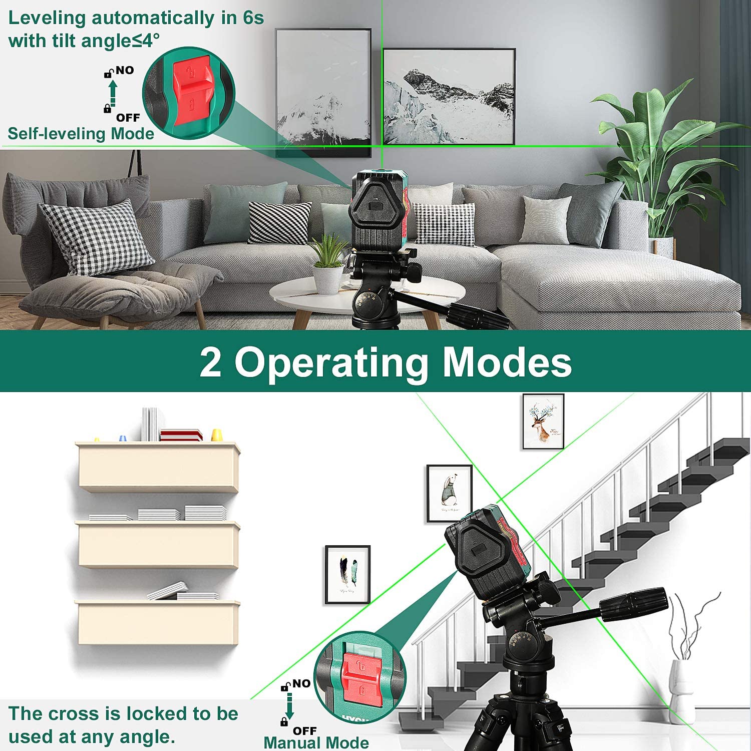 Livella Laser Autolivellante a Croce, IP54 per Esterno, Modulo Linea Verticale/Orizzontale Laser, Borsa per Trasporto, Supporto Magnetico, 360° Rotante. Livella Laser dotato di 2 trasmettitori laser(Classe laser:2), offre la commutazione libera di 3 modalità di proiezione: linea trasversale, linea verticale e linea orizzontale. Quando l'angolo di inclinazione è inferiore o uguale a 4 °, il misuratore di livello laser lo livellerà automaticamente, il che è adatto per l'installazione di piastrelle e murale. La regolazione automatica e la modalità di blocco possono essere commutate con solo un pulsante. Fornito una batteria ricaricabile 1200 mAh, il cavo di ricarica USB incluso può essere caricato direttamente in qualsiasi porta USB, la corrente di ingresso massima è di 600 mA e può essere ricaricata completamente entro 2 ore Elettricità e può durare per 6 ore. IP54 può essere antipolvere e antiurto. La distanza della luce è di 45 metri. Rispetto al proiettore della linea di luce rossa, Livella Laser Autolivellante Verde ha una maggiore visibilità. La sua luminosità del fascio è almeno il doppio di quella del laser rosso, anche alla luce solare parziale. Può funzionare bene anche in ambienti illuminati. Dotato di supporto magnetico a L, facile da fissare e utilizzare. Può essere montato su un treppiede e può essere ruotato di 360 gradi liberamente e proiettare la linea laser in qualsiasi posizione o angolo o regolare l'altezza dal treppiede