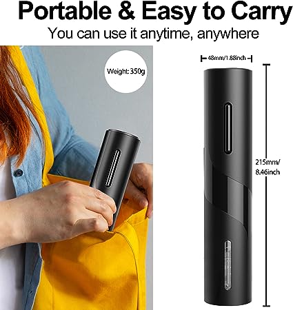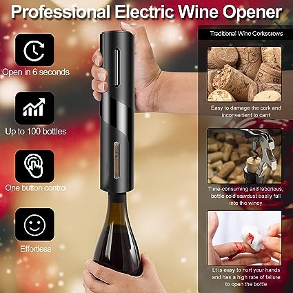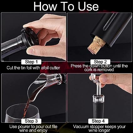Combinazione apribottiglie elettrico per vino, taglia stagnola, versatore aeratore per vino e tappo sottovuoto. Siamo una soluzione all-in-one per aprire, versare e conservare il vino. Con questo set puoi aprire perfettamente le bottiglie di vino e versarle senza sforzo. Facile da Usare e Veloce da Aprire- Questo cavatappi per vino funziona a batteria (batteria non inclusa). Può rimuovere facilmente il tappo in pochi secondi rimanendo completamente intatto. È compatibile con la maggior parte delle dimensioni delle bottiglie di vino. L'apribottiglie automatico è realizzato in ABS di alta qualità, PC, sicuro e resistente. Ha un aspetto elegante che può fondersi con la decorazione circostante. Bella e liscia forma curva, la superficie è nera satinata con una buona sensazione della mano, comoda e facile da impugnare