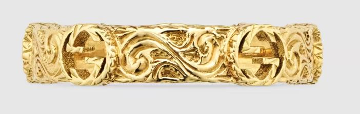 Codice distintivo della Maison, il logo GG è riproposto nel dettaglio intagliato che orna questo anello. Presentato in oro giallo 18 carati, il gioiello è ulteriormente arricchito da incisioni in stile Arabesque. Oro giallo 18 carati - Incisione Arabesque lungo l'anello con dettagli GG cut-out - Gucci garantisce, al proprio interno e nella propria filiera, il rispetto degli standard di Responsabilità Sociale e Ambientale in coerenza con la sua strategia di sostenibilità. L’oro, il platino e i diamanti Gucci sono certificati dal Responsible Jewellery Council, istituito per promuovere pratiche etiche, sociali e ambientali responsabili, volte a garantire il rispetto dei diritti umani in tutta la filiera dell’oro e dei diamanti, dalle miniere alla vendita
