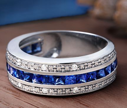 Oro bianco, con un pavé centrale di zaffiri blu sublimato da due file di diamanti e fiori d'Oro. 8 Diamanti: 0.064 carati - Oro bianco (18 carati = 750/-): 6.66 g. 19 Zaffiri blu - Totale pietre : 1.938 carati.