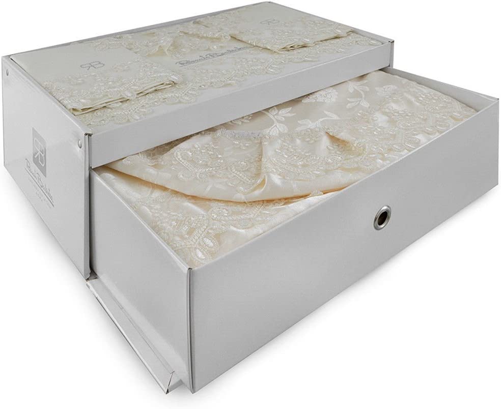 La confezione contiene un coordinato letto 6 pezzi per letto matrimoniale composto da:: 1 lenzuolo sopra 1 lenzuolo sotto con angoli 2 federe a sacchetto 1 copriletto leggero con angoli stondati 1 centrino Bordati con pizzo macramé Logo Renato Balestra brillantinato con strass swarovski Fondo tinta unita con motivo floreale tono su tono traslucido - Dimensioni: Lenzuolo sotto con angoli: 180x200 cm Lenzuolo sopra: 250x300 cm Federe: 50x80 cm Copriletto: 260x260 cm Centrino: 50x50 cm - Lo stile classico è intramontabile nonostante le mode che vanno e vengono. Lo contraddistinguono colori neutri e decori con merletti e pizzi come quelli che troviamo nel completo letto Noemi di Renato Balestra. Una perfetta unione tra qualità e buon gusto che rende ogni camera da letto un luogo confortevole e riposante