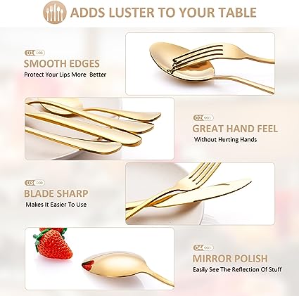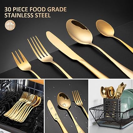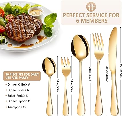 Il set da 30 pezzi include: 6 coltelli da tavola/6 forchette da tavola/6 forchette da dessert/6 cucchiai/6 cucchiaini. Le posate multipezzo sono una buona scelta di famiglia. Design semplice e classic - L'aspetto semplice e il design classico con manico rotondo si abbinano alle stoviglie e alle stoviglie esistenti. Con una finitura lucidata a specchio, la grande maestria di queste posate assicura che non ci siano punti ruvidi - Facile da pulire e lavabile in lavastoviglie - Questo set di posate è facile da pulire e lavabile in lavastoviglie. Quindi puoi lavarli in lavastoviglie per risparmiare lavoro. Tuttavia, per una migliore protezione delle posate, si consiglia di lavarle a mano e di tenerle poi asciutte.