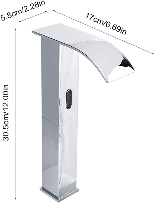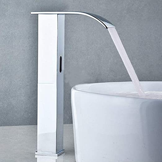 Rubinetto Lavello Bagno Touchless con Sensore Automatico, Rubinetto con Sensore a Infrarossi, a Cascata - Le rubinetto realizzate in corpo in rame di alta qualità, resistenza alle alte temperature, resistenza alla corrosione. Dispositivo schiumogeno di qualità, che impedisce gli schizzi di fiori d'acqua, acqua dolce e risparmio idrico. Placcatura multistrato della superficie, brillante come uno specchio. Alte Prestazioni: Uscita acqua fine curva, più bella nell'aspetto. Il rubinetto del sensore a infrarossi si accende e si spegne automaticamente. Intervallo di Induzione: 15-20 cm, quando il sensore è attivato, fornisce automaticamente acqua non appena le mani si trovano nel raggio di rilevamento e si ferma quando si allontanano le mani. Materiale rame - Non sono necessarie batterie