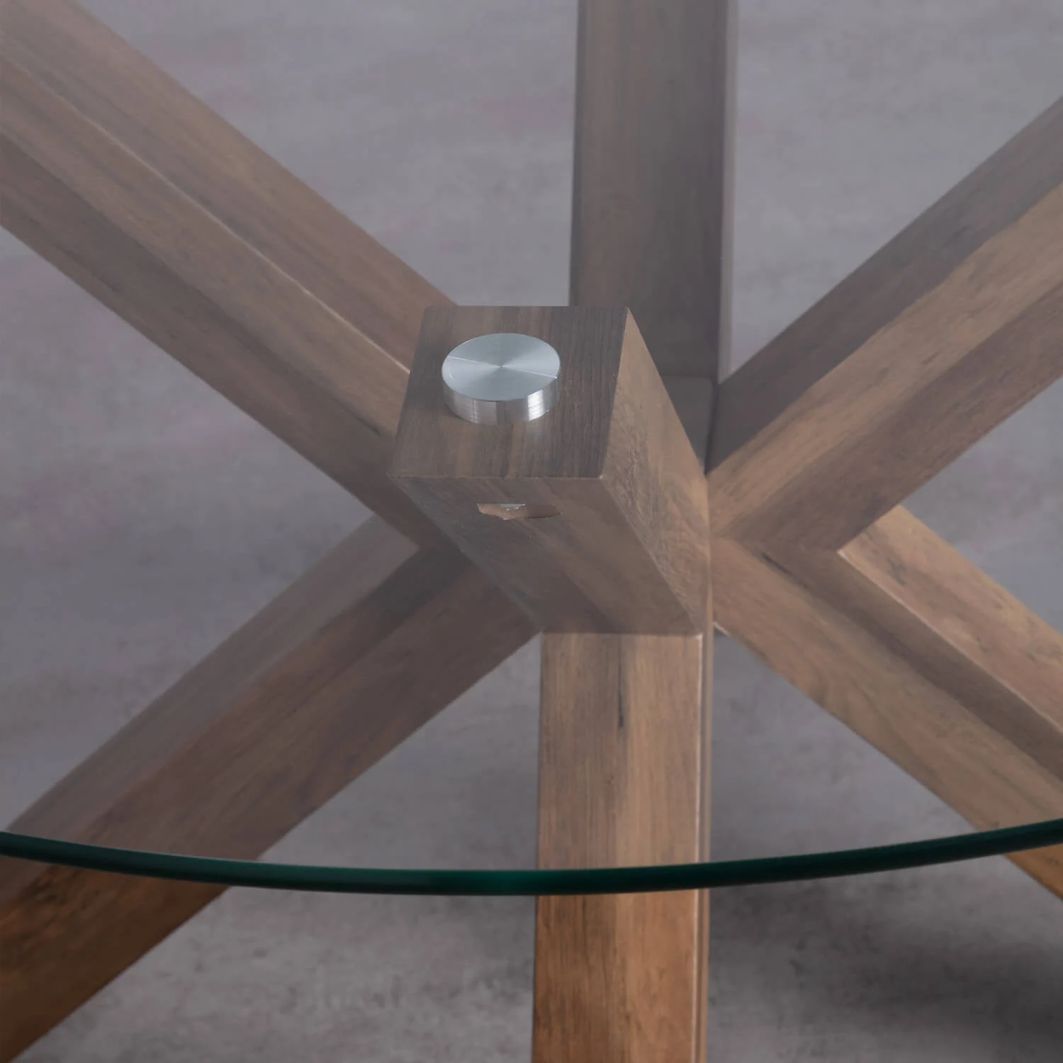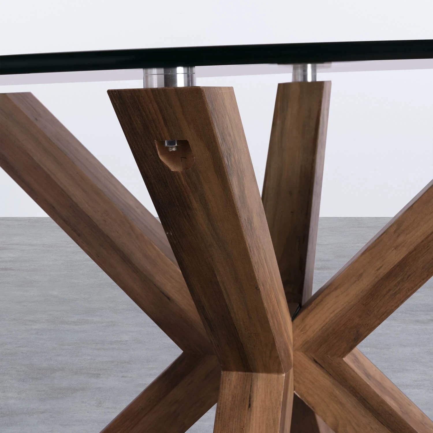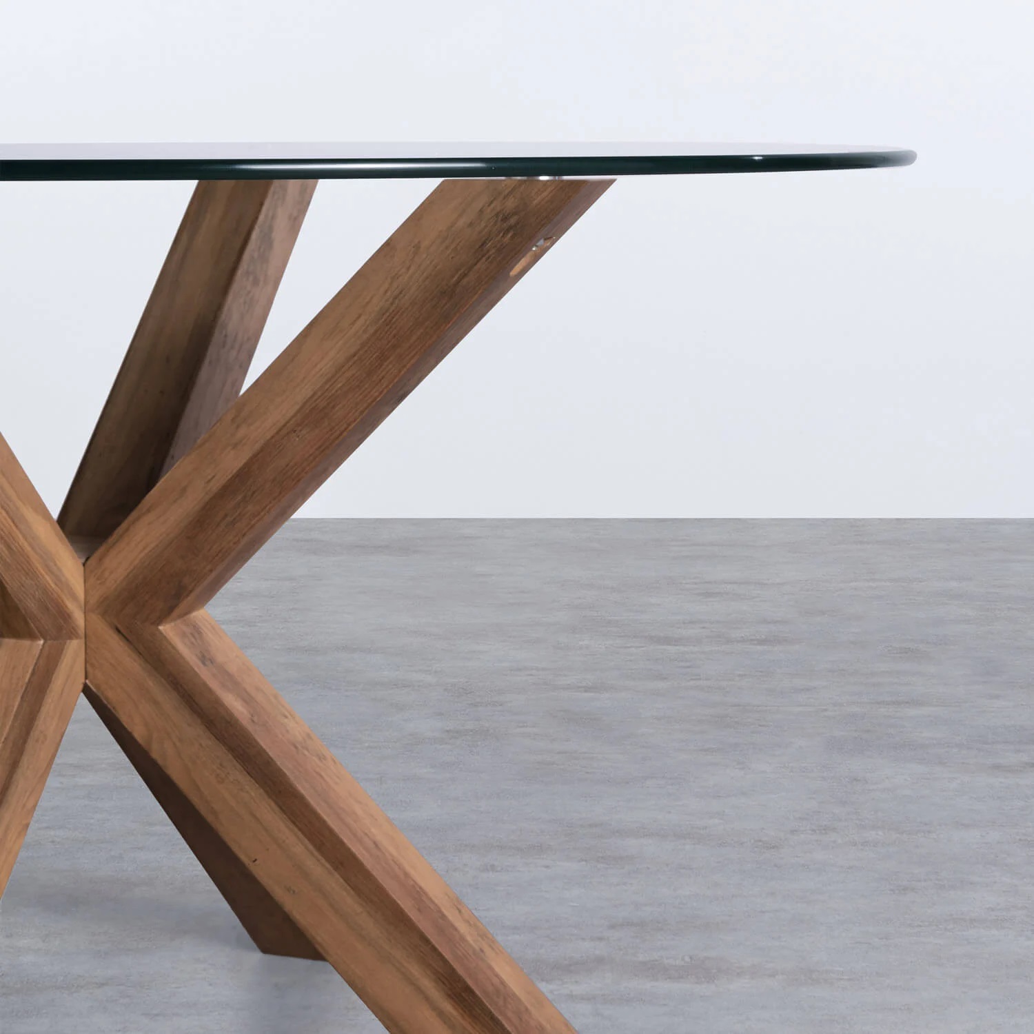 Tavolo dal design originale per sala da pranzo, ideale per ambienti moderni, minimalisti o rustici. È composto da un ripiano circolare in cristallo temperato completamente trasparente con uno spessore di 10 mm. Poggia su una base unica di gambe incrociate a forma di stella, realizzate in MDF rivestite con carta stampata che imita le venature naturali del legno di rovere. Altezza:73,5 cm - Larghezza: 120 cm - Profondità: 120 cm - Larghezza Gambe: 79,5 cm - Peso: 29 kg