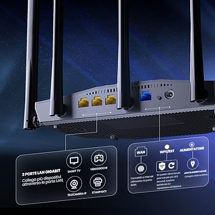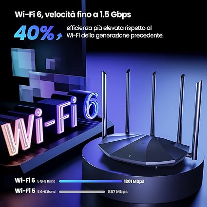 Router Wi-Fi 6: RX2 Pro permette una velocità fino a 1501 Mbps (2.4 GHz: 300 Mbps; 5 GHz: 1201 Mbps) Elimina le zone d'ombra Wi-Fi: RX2 Pro è dotato di 5 antenne esterne da 6 dBi e di un modulo ad alte prestazioni per il miglioramento del segnale che aumenta la trasmissione del segnale e la sensibilità di ricezione, fornendo una copertura Wi-Fi 6 sempre ottimale. Riduci al minimo i lag: migliora significativamente le prestazioni e l'efficienza della rete con le tecnologie MU-MIMO + OFDMA, per una navigazione in Internet con bassissima latenza. Porte LAN Gigabit: connessione di più dispositivi cablati per una velocità di trasferimento elevata grazie alle porte Gigabit. WPA3: RX2 Pro è dotato del nuovo standard di sicurezza WPA3, che protegge la privacy della tua rete Wi-Fi. Questo è un router non un modem router