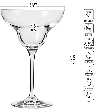 VETRO CRYSTALLINE – Vetro Crystalline di ottima trasparenza non solo espone il contenuto dei calici ma li rende particolarmente durevoli e resistenti. Adatto alla lavastoviglie. SET DI 6 CALICI – I calici classici da Margarita piaceranno non solo ai connaisseurdi questa bevanda. Il Margarita preparatoin casa sarà apprezzato per il suo gusto e per come si presenta. FORMA PARTICOLARE – La forma caratteristica a vetro sottile, ovvero il bevante largo e tondo, lo stelo allungatoe slanciato permettono di sottolineare tutti i valori del drink, aspetto, gusto e aroma. CAPACITA' 270 ML – Calice in vetro perfettamente trasparente, ha un'altezza di 169 mm e un diametro di 114 mm. Diventa pertanto ideale sia durante le feste che nell’uso quotidiano.