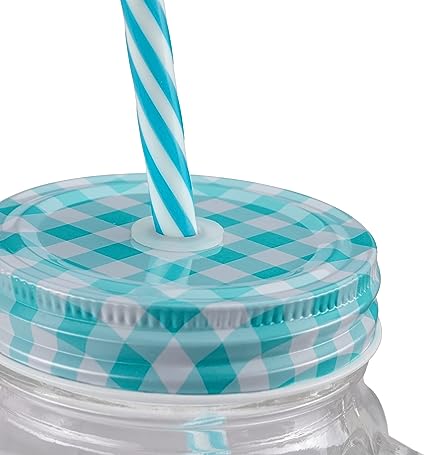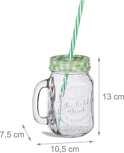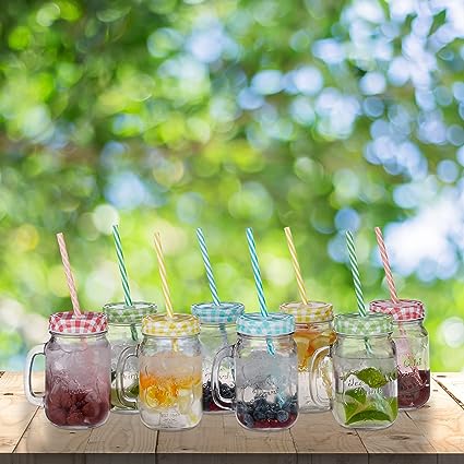 Set 8 bicchieri: bicchieri per bevande con manico in stile vintage e cannucce riutilizzabili incluse. Mix di colori: con coperchio a quadri colorati - in set 2 bicchieri rossi, 2 gialli, 2 verdi e 2 blu. Design vivace: bicchieri con tappo avvitabile, manico e cannuccia - ideale per le feste in giardino. Caratteristiche: capacità di 400 ml - per limonata, tè freddo, cocktail e molte altre bevande. Lavastoviglie: dopo l’utilizzo possono essere messi in lavastoviglie senza coperchio e cannuccia