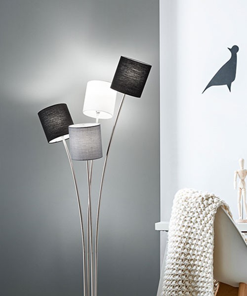 Perenz Joker 6870 CR - Lampada moderna da terra con paralumi in tessuto nero, bianco e grigio. Dotata di interruttore a pedale posizionato sul cavo di alimentazione. 4 luci a LED x 12w = 400w, attacco E27. Consegna tempo minimo 10 gg