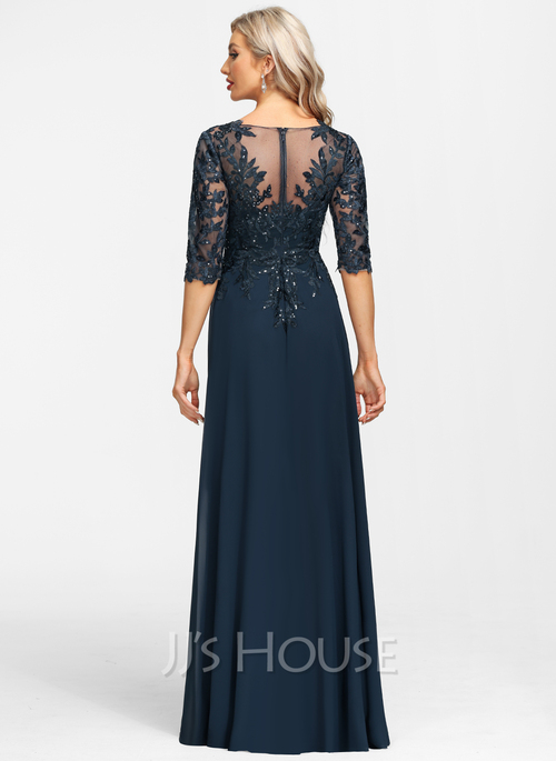 Tubino scollatura a V - A terra - chiffon - pizzo - abito da sera decorato con lustrini - Blu marino scuro - Solo lavaggio professionale in tintoria