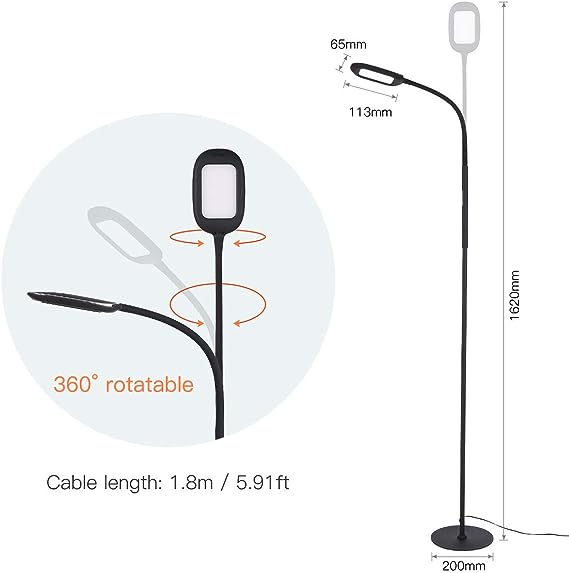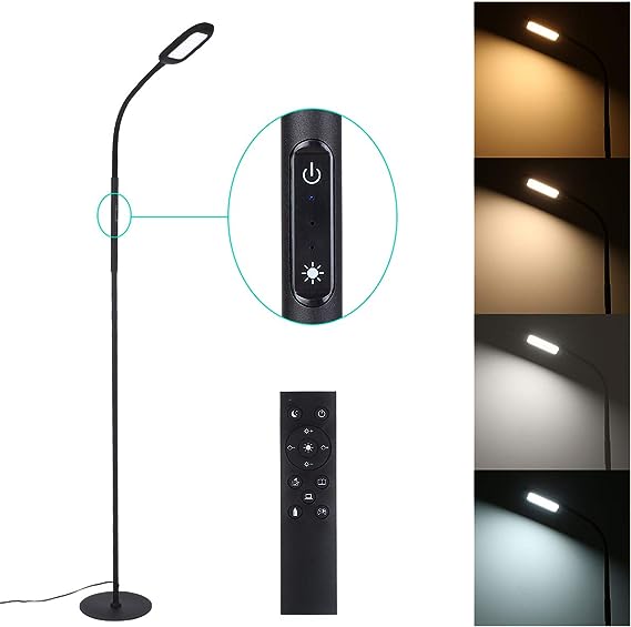 Teckin LED Touch - 5 temperature di colore - Lampada da terra a 4 livelli di luminosità con collo di cigno regolabile - Dimmerabile per la lettura - Lampadina inclusa - Potenza: 11-15W - Materiale del corpo: Acrilonitrile - butadiene - Polietilene, PC - Regolabile - Interruttore a sfioramento - Fonte di energia: CC - Sorgente luminosa: Lampadine a LED - Certificazione: RoHS,FCC,CE Tensione: 12V - Lumen: 1800LM