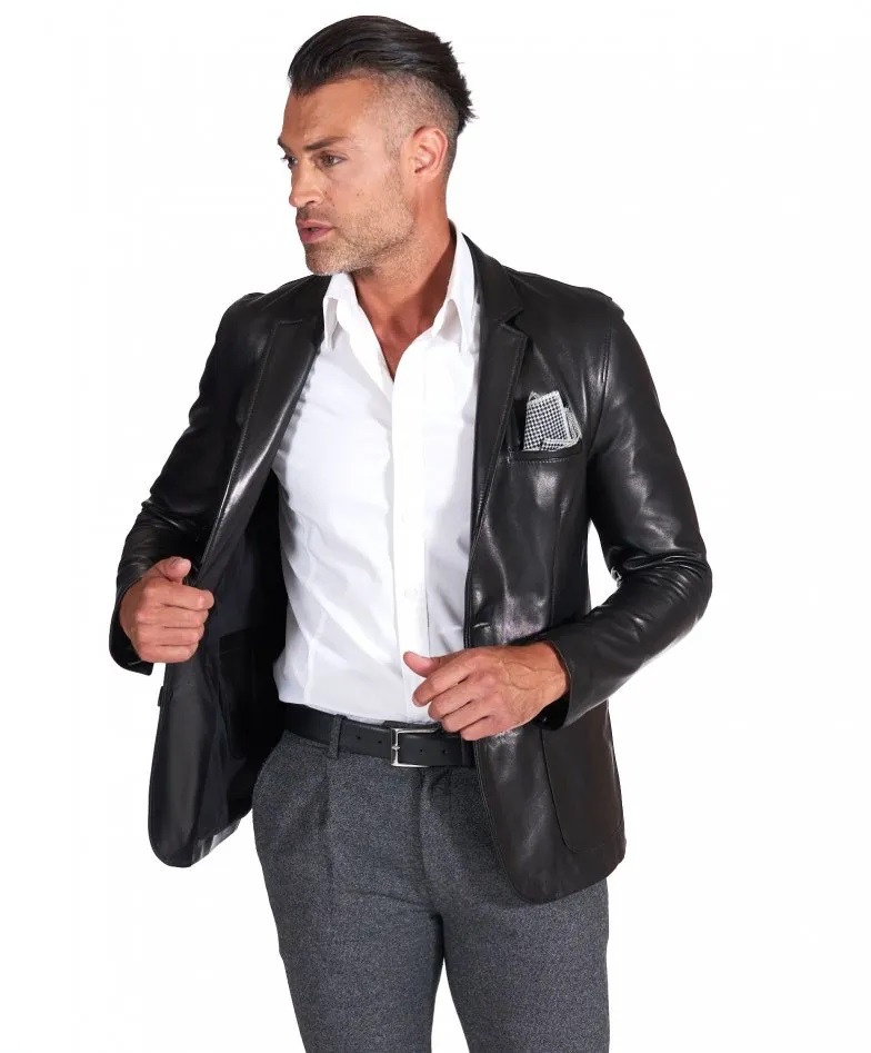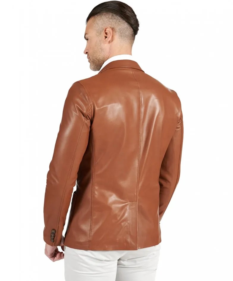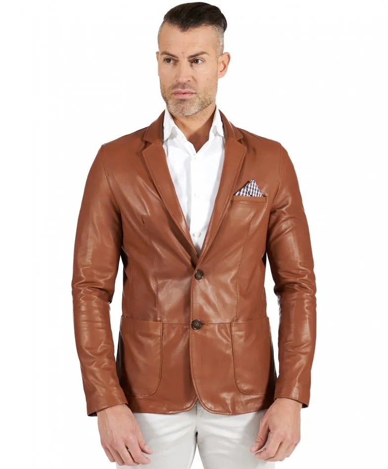 Luke - Blazer in pelle naturale cuoio con taschino e fazzoletto - Giacca classica in vera pelle da uomo, chiusura bottoni, pelle di agnello naturale effetto liscio, colore cuoio - 2 tasche frontali applicate; 1 taschino con fazzoletto; 1 tasca interna a filetto con bottone; 1 tasca interna in pelle applicata per smartphone; chiusura centrale 2 bottoni; bottoni alle maniche; spacco centrale dietro; vestibilità slim fit. Il modello è alto 1.82m e indossa una taglia 50.