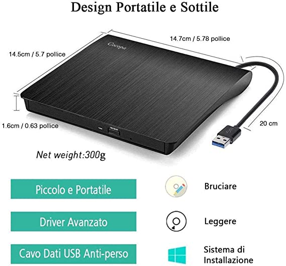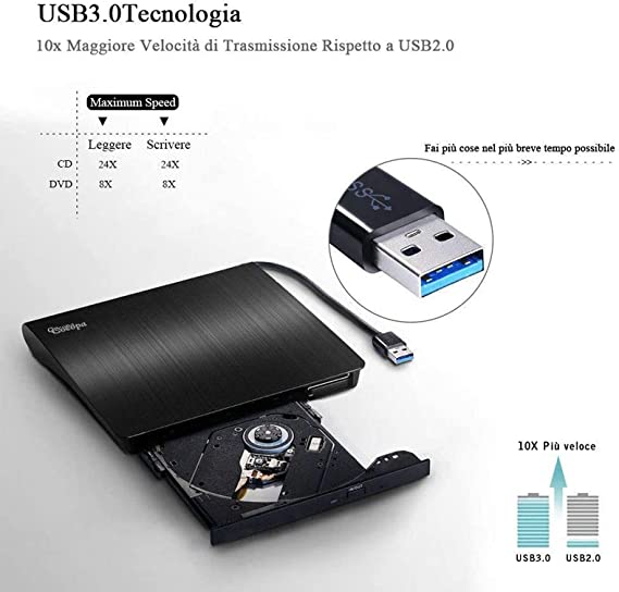 Lettore e masterizzatore dvd esterno prestazioni stabili e tecnologia avanzata: Tecnologia USB 3.0 avanzata (compatibile con le versioni precedenti USB 2.0 e USB 1.0), l'unità CD / DVD portatile TeeBeg Ultra-Slim è dotata di interfaccia USB 3.0 ad alta velocità, Questa unità CD esterna CD può portare una trasmissione dei dati più veloce e prestazioni stabile. Velocità (fino a un massimo di 6 Gbps) e forte tolleranza agli errori - Connettore USB 3.0 / 2,0 alimentato e trasmesso da un solo cavo USB 3.0, senza bisogno di cavo di alimentazione extral. La maggiore velocità di trasmissione offre un'esperienza migliore rispetto alla vecchia unità DVD,indipendentemente dalla visione di film, dall'ascolto di musica, dalla masterizzazione di dischi, dall'installazione di software. L'unità DVD USB 3.0 è un compagno perfetto per i computer senza i supporti di formattazione interni 【Avantage】: questa unità DVD esterna è alimentata dalla porta USB. non è necessario il driver e l'alimentazione esterna. Basta collegare l'unità DVD esterna all'interfaccia USB del laptop, premere il pulsante a comparsa e mettere il disco sul vassoio, verrà automaticamente riconosciuto e riprodotto
