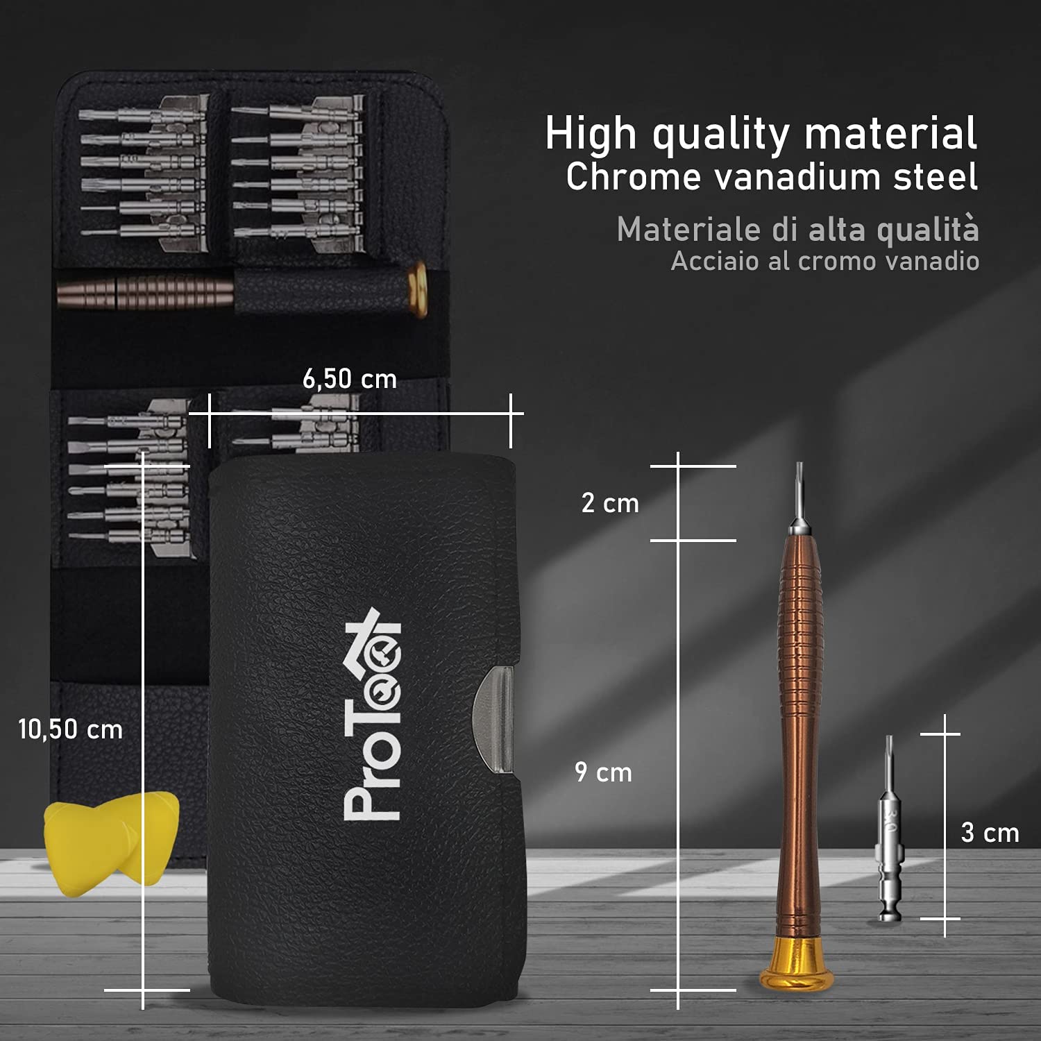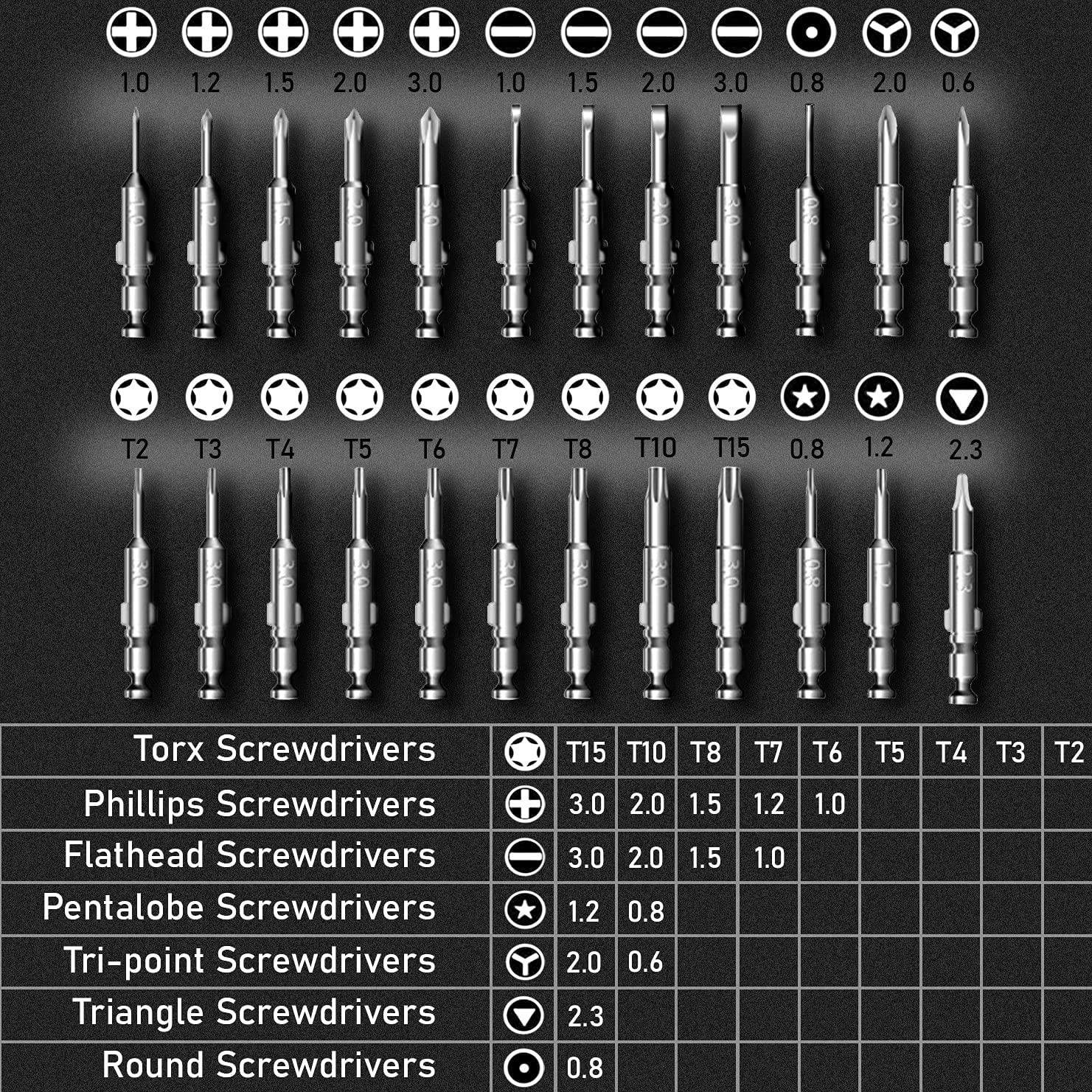 Set di cacciaviti di precisione studiato nei minimi dettagli per creare un Connubio Perfetto di Qualità e Praticità. il set di mini cacciaviti è uno strumento perfetto per tutte le riparazioni meccaniche di precisione. Cacciaviti top quality in acciaio al cromo vanadio. Kit Riparazione per Occhiali, Smartphone, Cellulare, PC, Laptop, iPhone, iPad, Tablet, Mac, Smartwatch, Elettronica e così via. In omaggio due comode leve. Un manico presa che girà su se stesso, cosi da poter avvitare e svitare comodamente senza girare il mini cacciavite. cacciavite a cinque stelle: 0.8 1.2, cacciavite Torx: T2 T3 T4 T5 T6 T7 T8 T10 T15, cacciavite triangolare: 2.3, cacciavite a Y: 0.6 2.0 , cacciavite a croce: 1.0 1.2 1.5 2.0 3.0, cacciavite piatto: 1.0 1.5 2.0 3.0, punta per cacciavite: 0.8- 1.2 , cacciavite a cerchio: 0.8 + 2 leve