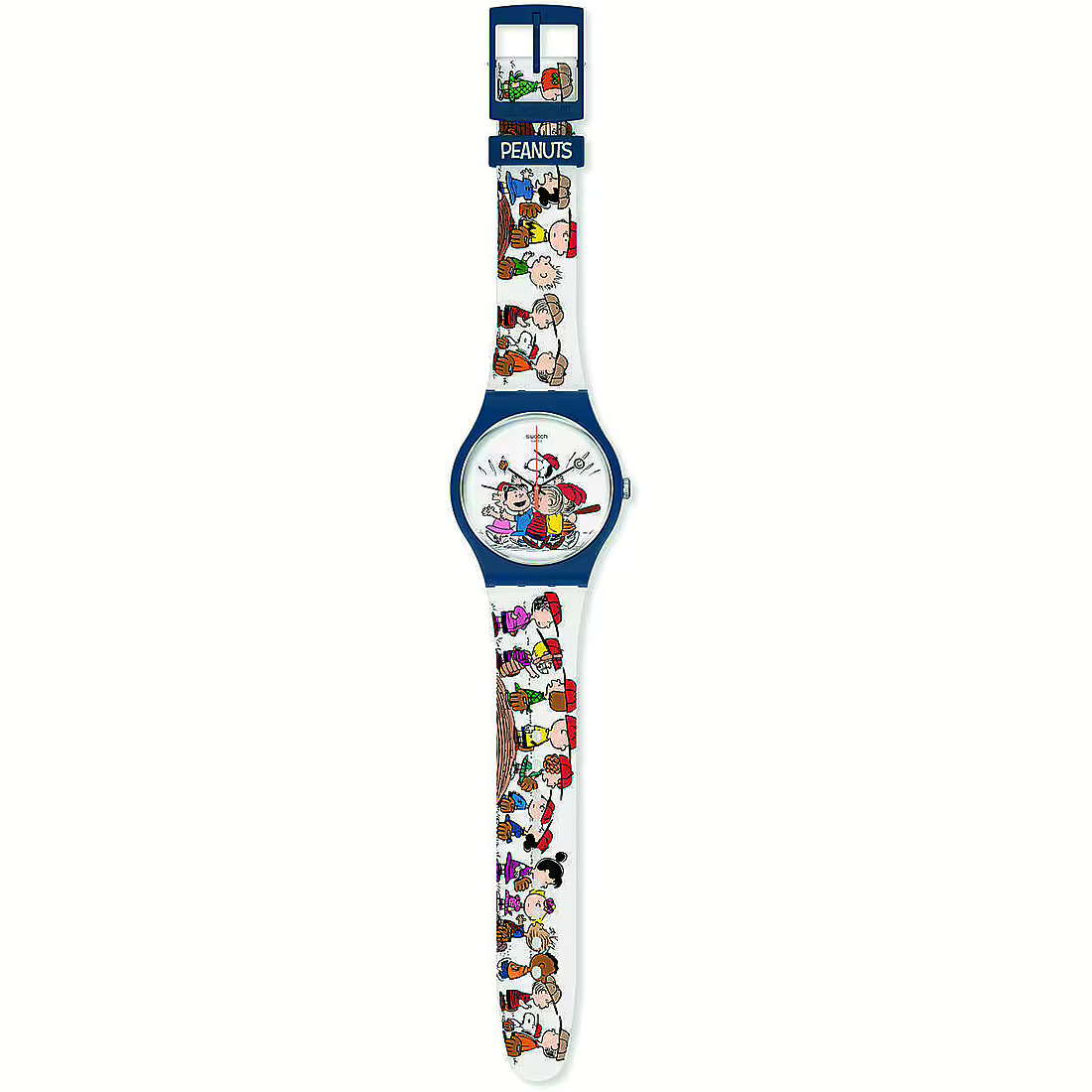 Orologio al quarzo Swatch unisex Peanuts - Orologio solo tempo unisex di Swatch della collezione peanuts. Orologio con cassa in materiale di origine biologica di colore blu e di forma rotonda con diametro di 41 mm. Orologio con cinturino in silicone di colore bianco con stampa multicolore e la distanza tra le anse è di 19 mm. La resistenza all'acqua è di 3 bar. Movimento: quarzo