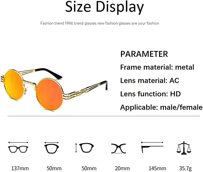 Protezione UV400: occhiali da sole rotondi - Il rivestimento di protezione UV400 blocca efficacemente il 100% dei dannosi raggi UVA e UVB, riduce l'affaticamento degli occhi. Elimina la luce riflessa e la luce diffusa. Materiale: struttura in metallo resistente con design a rotondo retrò, cerniera a molla più flessibile e comoda, adatta a tutti i tipi di volti di persone. Le lenti sono realizzate in materiale acetato (AC) che è leggero, non facile da graffiare o danneggiare da graffi durante il normale utilizzo