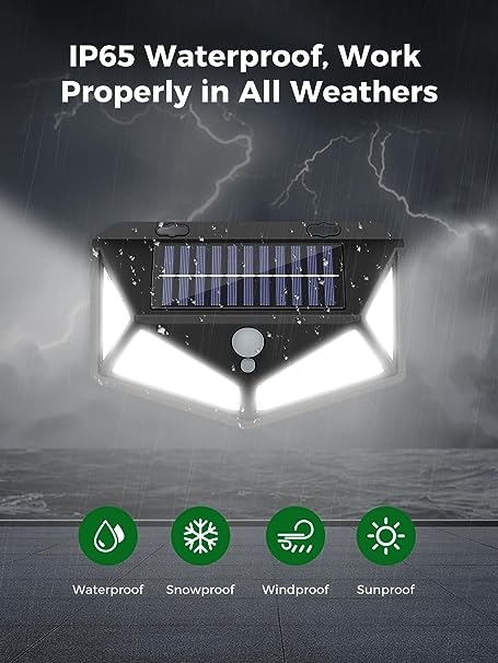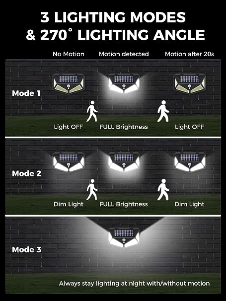 236 LED e angolo di illuminazione di 270°- La lampada solare COLBOR è dotata di 236 perline LED luminose e un design di illuminazione a tre lati, offre un angolo di illuminazione fino a 270°, che può portare un'illuminazione più luminosa e una gamma di illuminazione più ampia rispetto ad altre luci solari da giardino. La luce LED solare è dotata di un sensore di movimento sensibile integrato, che può catturare con precisione il movimento di esseri umani o animali entro 3-5 metri e ci sono tre modalità di illuminazione intelligenti tra cui scegliere: sensore corporeo + modalità luce attenuata, modalità sensore corporeo, modalità luce costante. Nessuna bolletta elettrica. Questa lampade solari da esterno ha un pannello solare ricaricabile ad alta efficienza e ad alta capacità, l'efficienza di conversione può raggiungere il 22%. Dopo una ricarica completa, la luce solare a led si accende automaticamente di notte e si spegne automaticamente durante il giorno. La luce con sensore di movimento da esterno solar è realizzata in ABS di alta qualità, che è impermeabile e resistente al calore, e può sopportare tutti i tipi di condizioni atmosferiche difficili. È appositamente progettata per l'uso esterno ed è molto adatta per il balcone, il giardino, il patio, il garage, il passaggio pedonale, il cancello, ecc. La confezione include le viti, è possibile installare facilmente le luci da giardino a led su una parete esterna. Si prega di installare la luce solare da esterno in direzione del sole per garantire che il pannello solare possa ricevere abbastanza luce solare. L'altezza di montaggio ideale è di circa 1,8-2,5 metri.