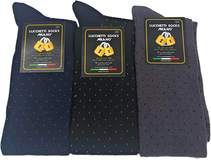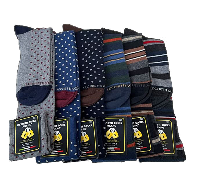 Lucchetti Socks Milano: Set da 6 PAIA di calze uomo lunghe - 92% Cotone - 5% Poliammide - 3% Elastan - .Le calze da uomo Lucchetti Socks Milano sono prodotte totalmente in Italia. I filati di produzione sono di altissima qualità. Materiali morbidi, colori reattivi, elastici che tengono ma non stringono. Calze curate in ogni particolare, vestibilità eccezionale, morbidezza unica - Le cuciture sono piatte, quasi impercettibili - Taglia unica da uomo che calza dal 41 al 46