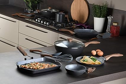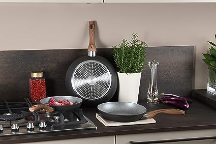 In alluminio forgiato per una distribuzione uniforme del calore. Fondo ad alto spessore adatto anche all'induzione Rivestimento interno antiaderente rinforzato a 4 strati Rivestimento esterno resistente alle alte temperature Manici con finitura soft touch effetto legno, antiscivolo e antiscottatura