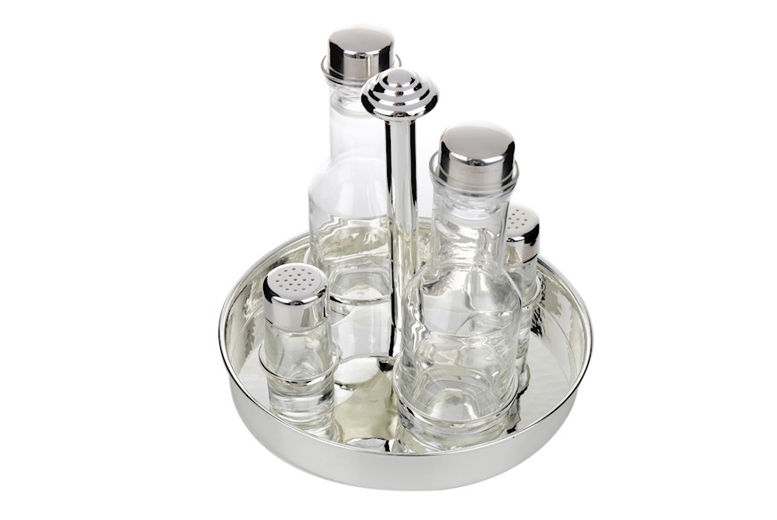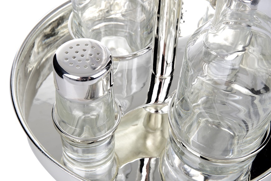 Menagere argento trilaminato olio, aceto, sale e pepe - Composto da: 4 pezzi - Made in Italy - Selezione Zanolli. Questo oggetto è stato fatto interamente a mano. Le sapienti mani del maestro argentiere hanno modellato e plasmato la lastra fino a farne un oggetto di esclusiva fattura. E’ realizzato con una lastra di materiale multistrato composta da due strati in argento 999/1000 che rivestono un’anima in rame; un esclusivo brevetto di fabbricazione, per una resa estetica declinata in forme di assoluta purezza e modernità, proprie del design “Made in Italy” di prestigio. Le proprietà antibatteriche dell’argento puro, note fin dall’antichità, si attivano a contatto con l’acqua, avviando un processo di purificazione assolutamente naturale e stabile, comprovato da rigorose analisi di laboratorio. Gli ioni d’argento esplicano la propria azione antimicrobica e antibatterica in forma continuativa, interrompendo il metabolismo e inibendo la riproduzione di tutti i microrganismi presenti. Il principale consiglio per garantire a questo oggetto una perfetta cura consiste nell'utilizzarlo con regolare frequenza, anche quotidiana. Si raccomanda di lavarlo a mano con detersivo delicato e una spugna non abrasiva, per mantenerne inalterate la brillantezza e le peculiari caratteristiche.