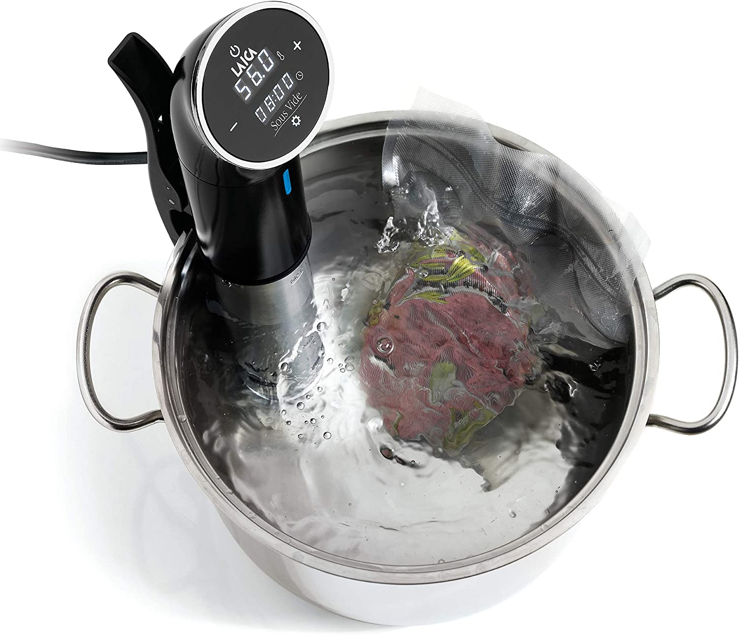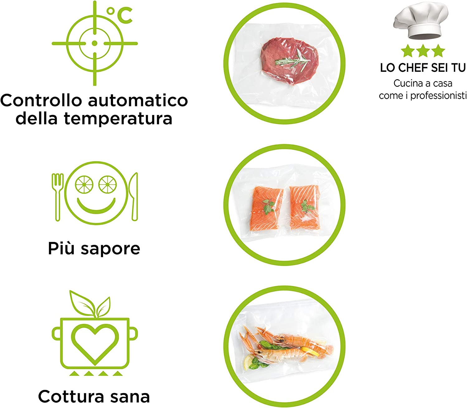 Cucina sana e dietetica: la cottura sottovuoto a bassa temperatura permette di cucinare cibi saporiti utilizzando pochi condimenti - Cucina a casa come al ristorante: la cucina sottovuoto, a bassa temperatura, esalta i sapori e gli aromi naturali dei cibi, garantendo sempre un risultato ottimale - Temperatura programmabile da 25°C a 95°C; display LED di facile lettura; tasti Touch sensor con attivazione a sfioro; protezione termica di sicurezza, impostazione timer fino a 99 ore, 59 minuti; pratico sistema di aggancio a pinza, per adattarsi a qualsiasi recipiente - Capacità di circolazione:6-15 - Alimentazione e potenza: AC220-240 V 50/60 Hz - 1200W - Salvaspazio: maneggevole, dimensioni ridotte, comodamente riponibile
