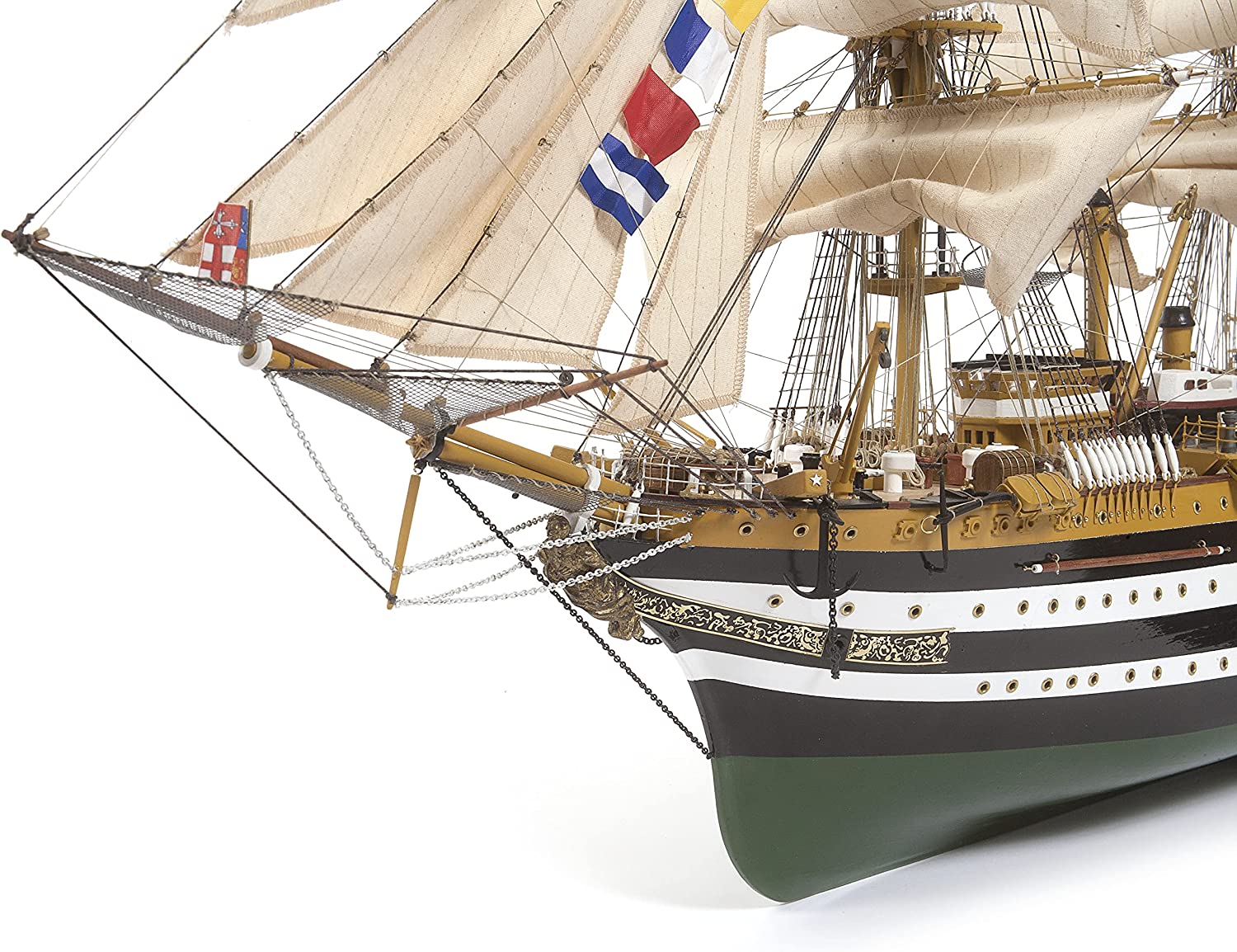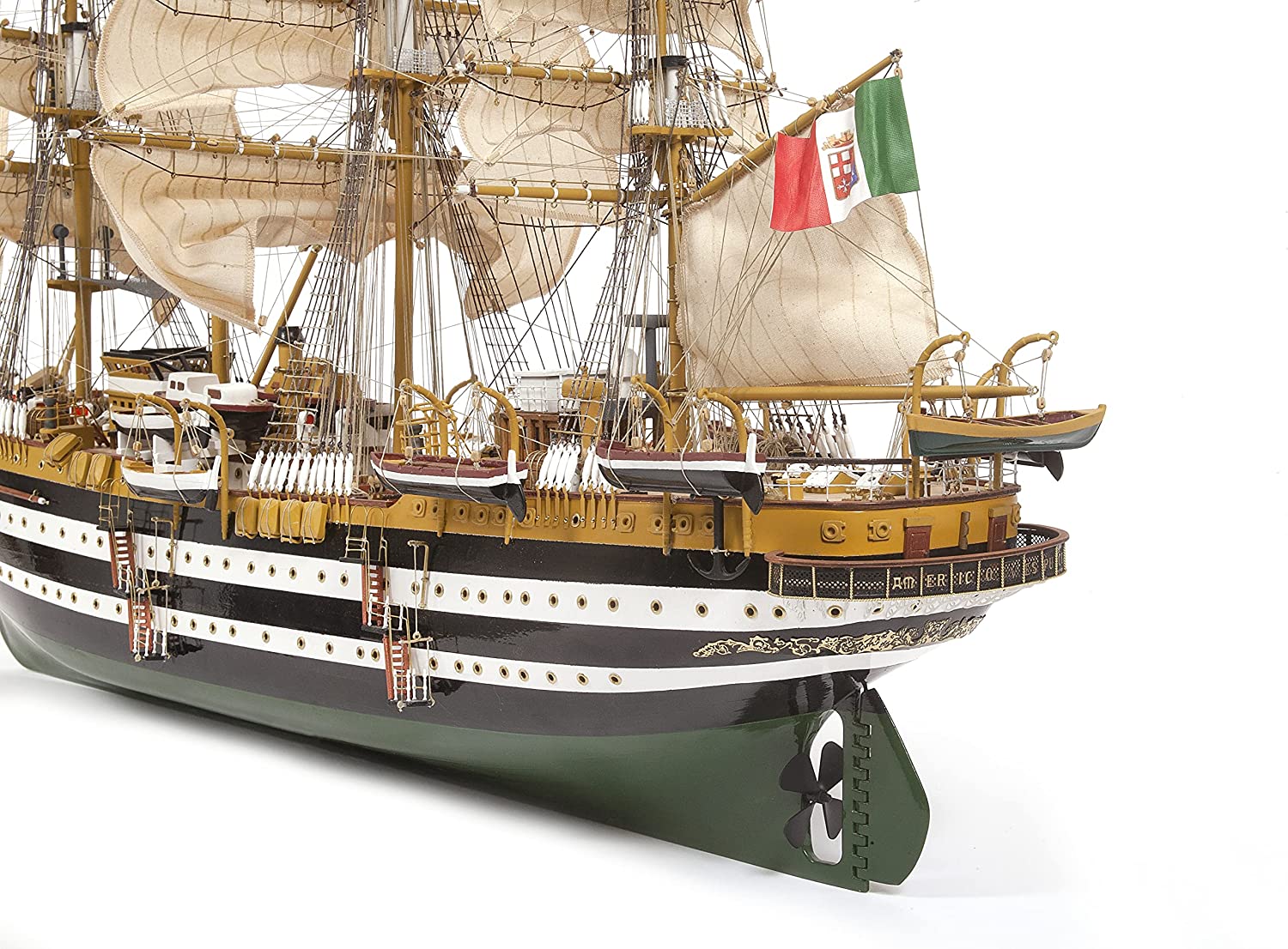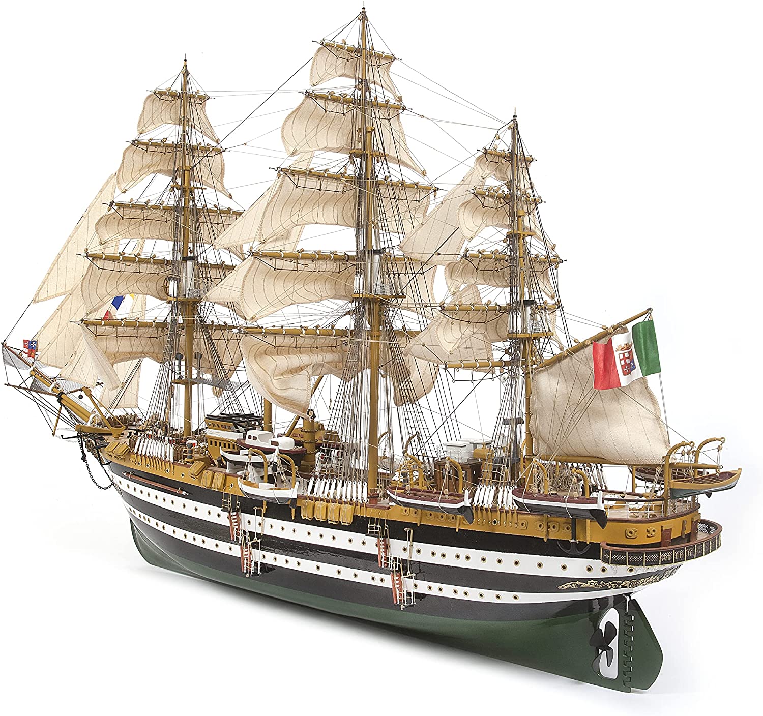 Più di 600 pezzi diversi per divertirsi a costruire il modello.. DIMENSIONI MODELLO FINITO : lunghezza 980 mm - larghezza 304 mm - altezza vele incluse 560 mm - Legno certificato FSC o PEFC. - Taglio ad alta precisione. - Ottone fotoinciso. - Fusioni altamente dettagliate. - Istruzioni in 5 lingue. - Foto HD passo dopo passo. - Elenco parti con misure e materiali. - Foglio IP per identificare le parti - Piani in scala.. - Modello di alta qualità. Amerigo Vespucci è l'attuale Accademia Navale della Marina Militare Italiana. Fu varato nel 1931 dai cantieri navali di Castellammare di Stabia. Fu progettato dal tenente colonnello Francesco Rotundi, seguendo le tendenze delle navi da guerra a vela, che ispirarono le linee e le proporzioni della nave a 3 alberi, con una lunghezza di 83 m, un albero principale di 55 m e una superficie velica di 3100 m. È il vero fiore all'occhiello della Marina Militare Italiana.