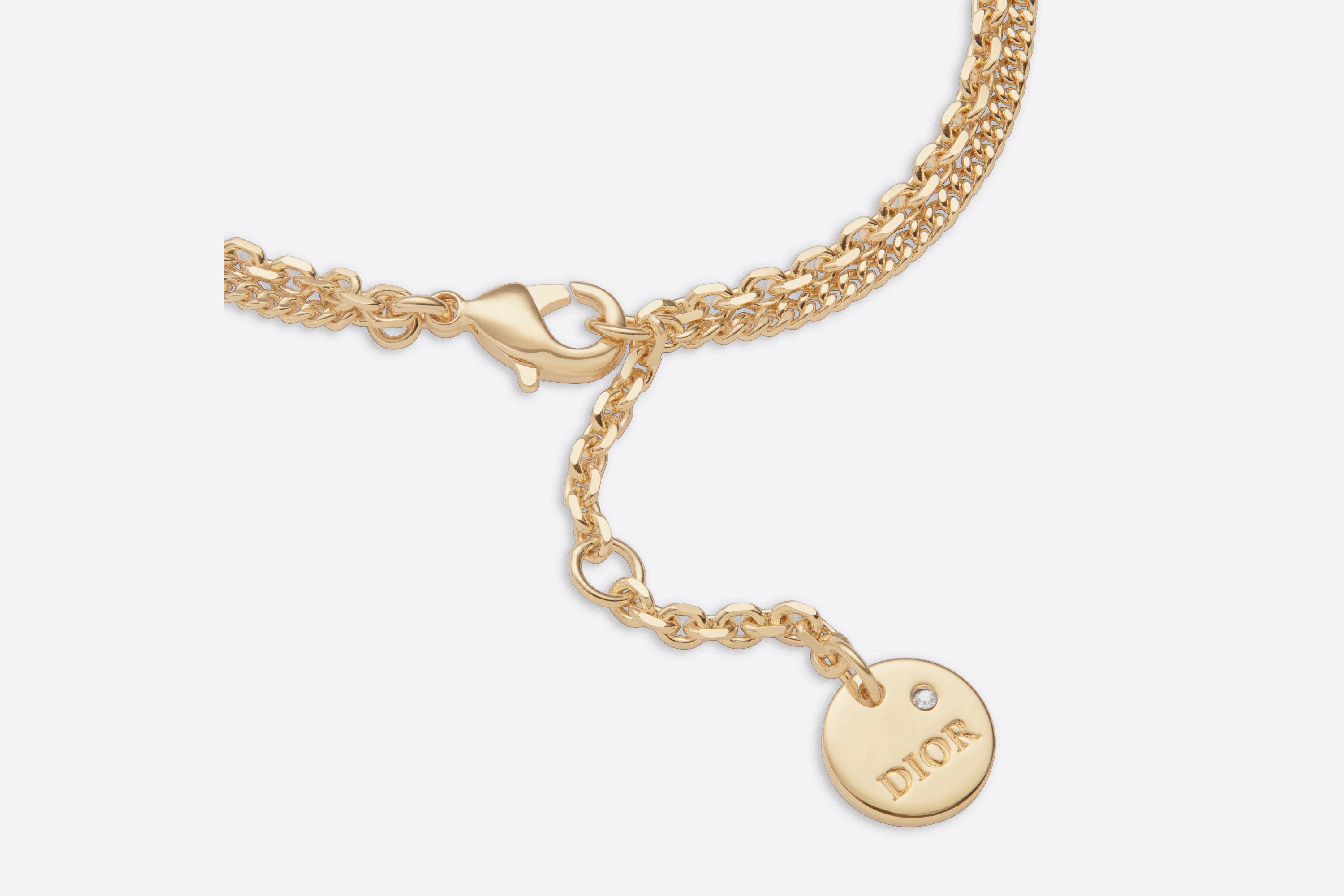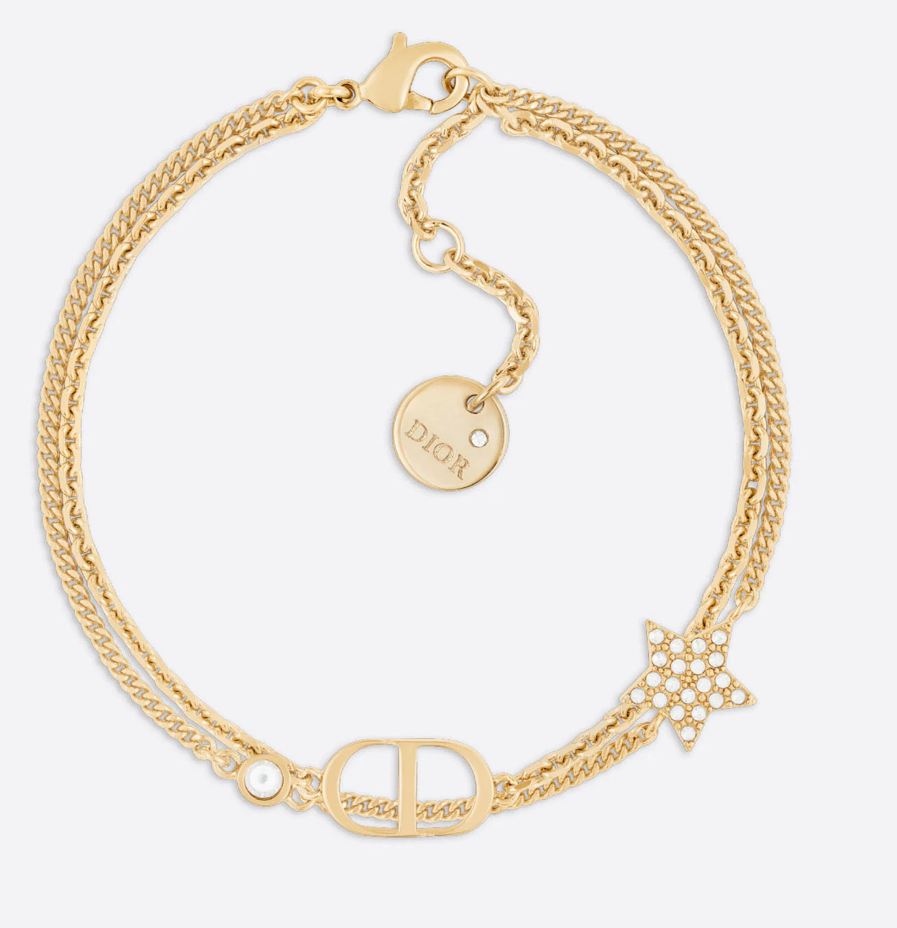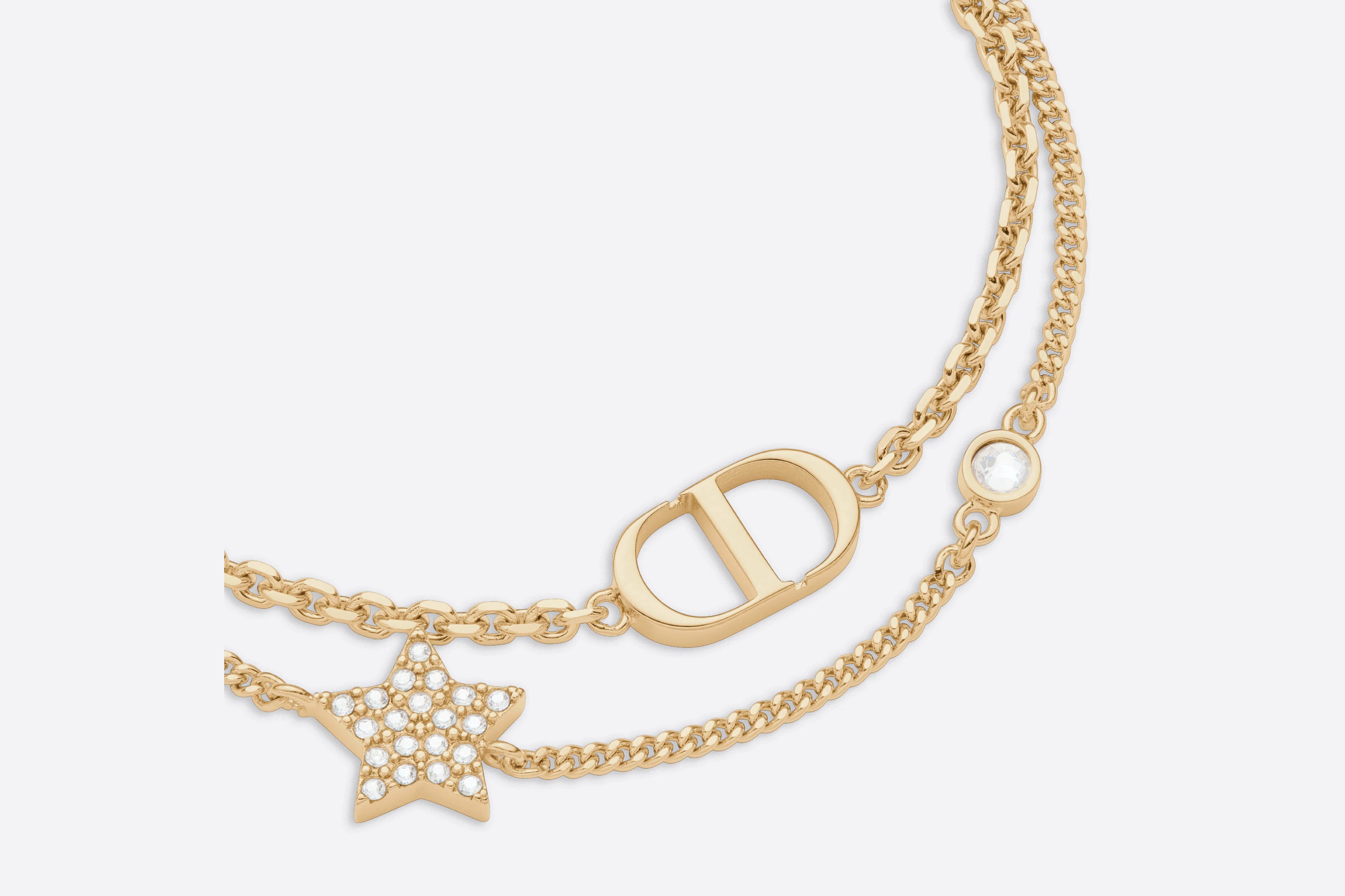 BRACCIALE DOPPIO PETIT CD - Questo bracciale Petit CD presenta la firma “CD” su una delle due catene in metallo con finitura color oro. Simbolo preferito di Christian Dior, una stella brillante con pavé di cristalli bianchi impreziosisce l’altra catena, ornata anche da un discreto cristallo bianco piccolo. Intramontabile ed elegante, può essere indossato tutti i giorni. Cristalli bianchi - Firma “CD” - Dettagli a forma di stella - Metallo con finitura color oro - Chiusura con moschettone - Lunghezza regolabile: 16-19 cm