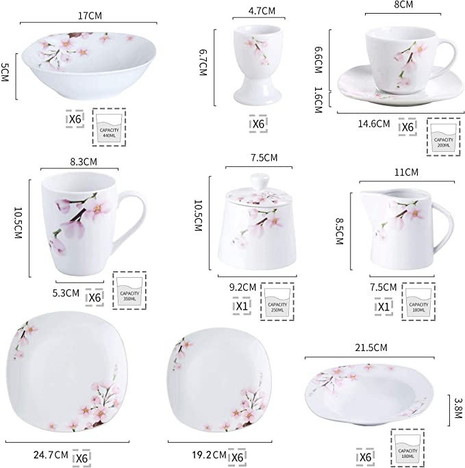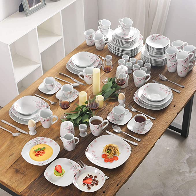 Coordinato da tavola per 12 persone con servizio da caffè e te - Composto da 100 pezzi - Approvato dalla FDA - In porcellana di grado AB e privo di BPA - Materiali ecocompatibil - Il servizio include 12 piatti piani (24,7 cm) , 12 piatti fondi (21, 5 cm), 12 piatti da dessert (19.2 cm), 12 Ciotole (17 cm, 7’’), 12 tazzine (175 ml, H 6.7 cm) e 12 piattini (14.7 cm), 12 Tazze Mug (350 ml, H 10.2 cm), 12 Portauova( 4,8 cm), 2 Zuccheriera (250 ml, H 10.5 cm) e 2 Bricchi per Latte (180 ml, H 8.5 cm)