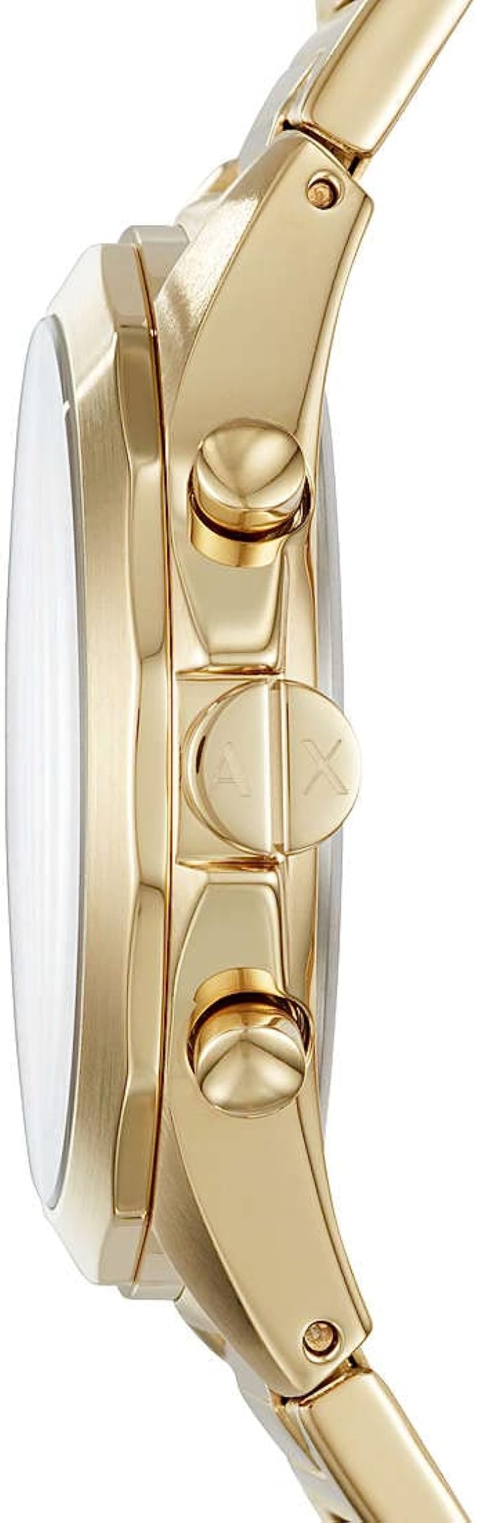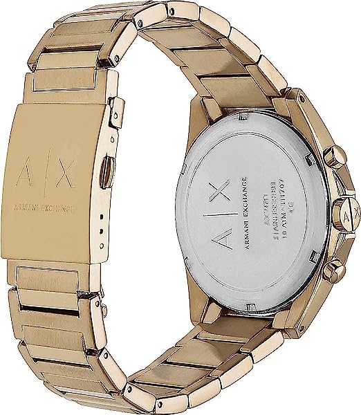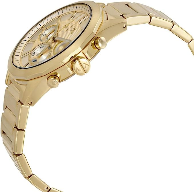 Armani Exchange Chronograph Orologio da uomo in acciaio inossidabile, cassa 44 mm - Cassa da 44 mm, larghezza del cinturino di 22 mm, cristallo minerale, movimento al quarzo, display analogico con cronografo, Cassa rotonda in acciaio con quadrante color oro Bracciale in acciaio color oro Resistente all’acqua fino a 50 m, indossabile per nuotare in acque basse