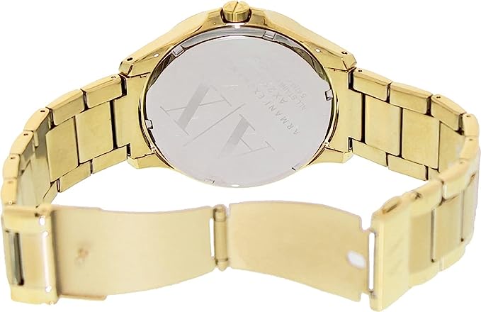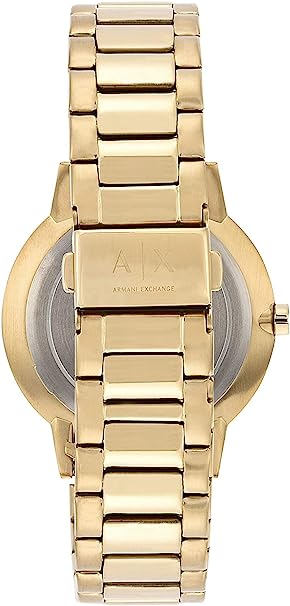 Armani Exchange Orologio a tre lancette da uomo, cassa in acciaio inossidabile da 42 mm e bracciale in acciaio inossidabile. Cassa da 42 mm, larghezza del cinturino di 20 mm, cristallo minerale, movimento al quarzo a tre sfere con display analogico. Cassa rotonda in acciaio con quadrante color oro - Bracciale in acciaio color oro Resistente all’acqua fino a 50 m, indossabile per nuotare in acque basse