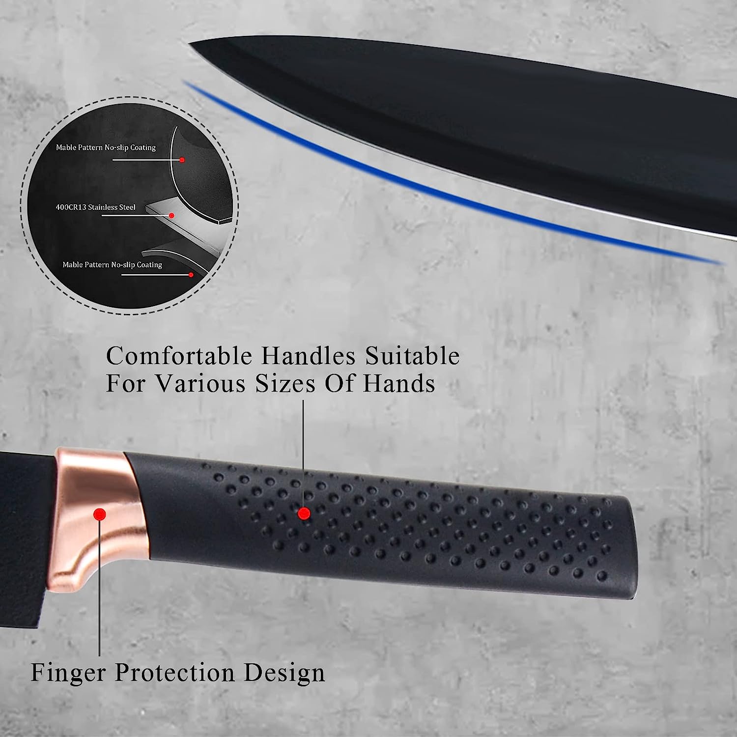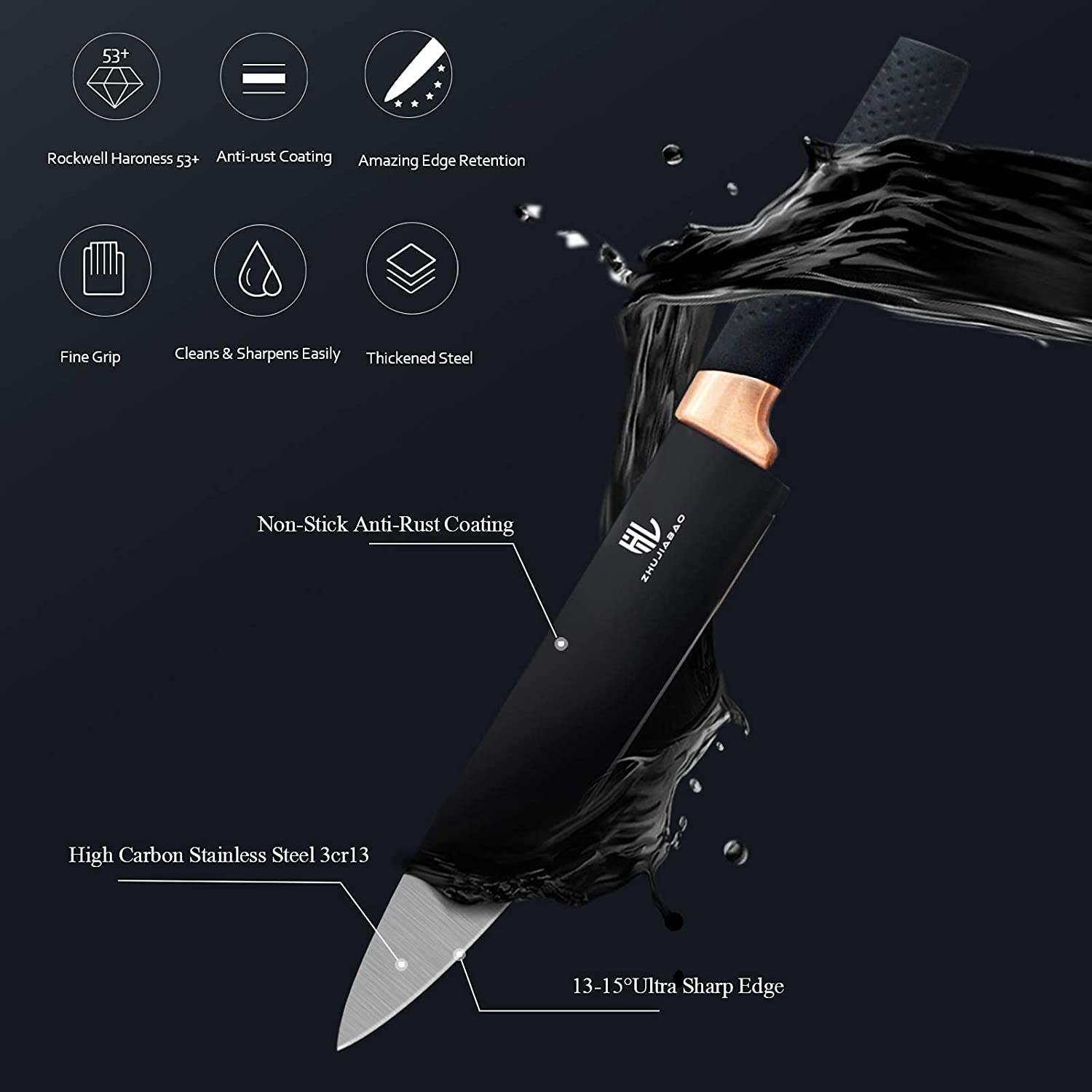 HL zhujiabao Set di coltelli da cucina nero con supporto in acrilico 6 pezzi Set di coltelli da chef professionale in acciaio inossidabile con rivestimento antiaderente e bordo ultra affilato. Il supporto girevole per coltelli Zhujiabao è dotato di cuscinetti antiscivolo nella parte inferiore, che evita il problema del supporto per coltelli e lo rende più sicuro e stabile. Il supporto per coltelli in acrilico con fibbia in oro rosa è più moderno e squisito. Fornisce un servizio di taglio affilato e aggiunge colori meravigliosi alla tua cucina. Acciaio di alta qualità e lama ultra affilata. Zhujiabao set di coltelli da chef in acciaio inox ad alto tenore di carbonio con blocco ha 53+ durezza rockwell e la lama raggiunge 13-15. La superficie del set di coltelli a blocchi ha un rivestimento antiaderente, che può proteggere la tua salute. Le prestazioni eccellenti consentono di mantenere un perfetto equilibrio tra il taglio di fette ultrasottili e il massimo spessore. Il set di utensili da cucina consente di tagliare vari ingredienti senza intoppi come il taglio del burro.Protezione delle dita e manico ergonomico: il manico ha un comodo rivestimento antiaderente e un design a punti che aumenta l'attrito tra il palmo e la maniglia. I paramani rosa rendono i coltelli più belli e migliorano il fattore di sicurezza dei coltelli da cucina. Il set di coltelli da chef è facile da pulire, devono essere lavati con acqua tiepida e mantenuti asciutti dopo l'uso. Il set di coltelli affilati professionale è lavabile in lavastoviglie, ma si consiglia di pulire manualmente per prolungarne la vita . La combinazione di coltelli include 8