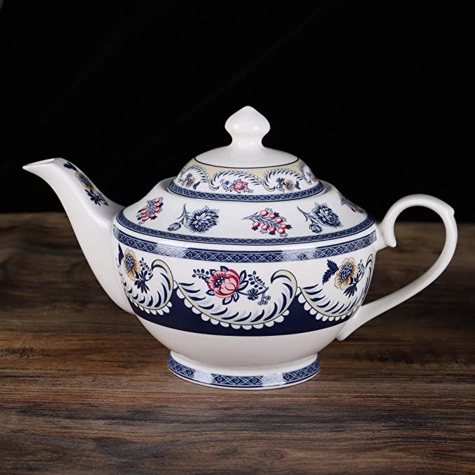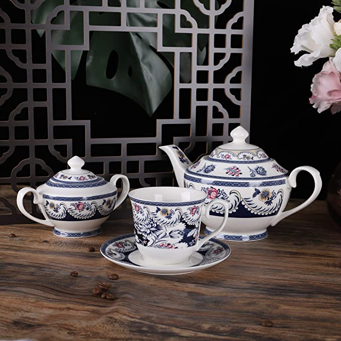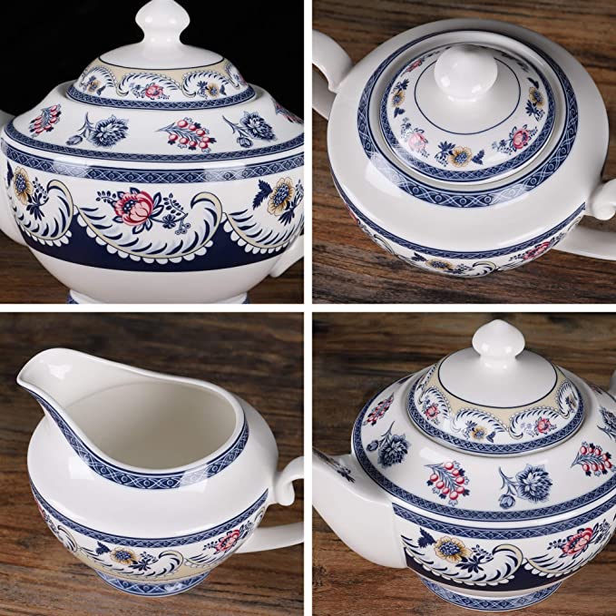Capacità della teiera: 1000 ml, dimensioni: 24 x 16.5 cm; Capacità della tazza: 250 ml, dimensioni: 13 x 7.5 cm; Zuccheriera: 400 ml, dimensioni: 15 x 11 cm; Barattolo del latte: 320 ml, dimensioni: 15.5 x 9 cm; Piattino: diametro 14.5 cm. Realizzato in porcellana di a qualità, senza piombo. Prodotto a Chao Zhou - Lavorare la porcellana di Chaozhou è uno dei famosi mestieri tradizionali della provincia del Guangdong