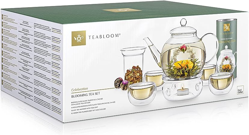 Questo set include tutto l'essenziale per un elegante tea party: teiera in vetro di alta qualità da 1,2 l con coperchio, infusore in vetro sfuso, scaldino e candela, quattro tazze di vetro a doppia parete da 100 ml e 12 fiori da tè in fiore in una confezione regalo. Teiera e tazze in vetro non poroso di qualità superiore: tutti gli attrezzi sono realizzati in vetro borosilicato durevole e resistente al calore e sono lavabili in piano cottura, microonde e lavastoviglie. Questo bollitore in vetro di alta qualità adatto ai fornelli è dotato di una maniglia ergonomica e di un beccuccio antigoccia. Tutto ciò che assapori è tè puro e delizioso. Versatile set di teiere in vetro per ogni tipo di tè: questo bollitore in vetro cristallino e gli accessori sono ideali per gustare tè in fiore, tè sfusi, bustine di tè e per infondere deliziose acque di frutta. Tieniti al caldo sopra lo scalda bicchiere a lume di candela o versa il tè sul ghiaccio per una rinfrescante opzione estiva.