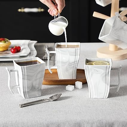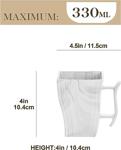 Capacità perfetta: ogni tazza da caffè contiene 330 ml, set da 6. Sono perfetti per cappuccino, caffè, tè, cacao, bevande brulé, tappi, cereali, farina d'avena o frullati proteici per te e i tuoi ospiti. Bella sensazione per loro, sia nel peso che nei materiali. Dimensioni e forma perfette, è ideale anche per la preparazione dalla macchina da caffè. Manico comodo da tenere: lo spazio tra il manico della tazza è ben progettato, quindi si adatta perfettamente alla tua mano, ti sentirai a tuo agio quando ti godi caffè, tè, cereali e cacao. Anche la glassa liscia potrebbe impedire che le macchie di caffè rimangano facilmente. Non dovrai più preoccuparti che il caffè rimanga troppo a lungo, rendendo la tazza di porcellana difficile da pulire, semplicemente la tua vita e risparmia tempo.Porcellana sicura e durevole: il set di tazze MALACASA è cotto ad alta temperatura per massimizzare la resistenza della porcellana. La porcellana non contiene piombo o cadmio, resistente alle scheggiature, sicura per l'uso quotidiano. Inoltre, il design minimalista e il classico colore grigio marmo rendono il set di tazze più classico ed elegante che lo rende ideale per l'ufficio o la casa.Lavabile in forno e lavabile in lavastoviglie: la cottura ad alta temperatura, rende le nostre tazze da tè MALACASA molto più dure e resistenti alle crepe. Perfettamente compatibile con acqua fredda e calda senza preoccuparsi di scheggiature, graffi, crepe e graffi. Facile da pulire e sicuro in forno, congelatore, lavastoviglie e microonde.