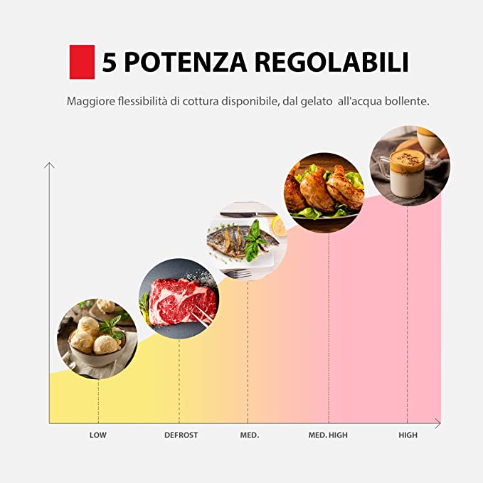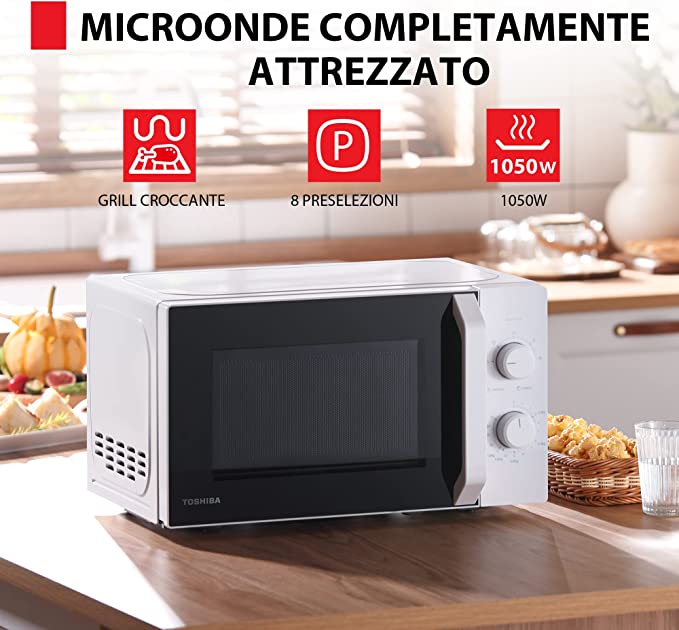 Per una maggiore flessibilità in cucina, dal caldo alla cottura di liquidi. Illuminazione a LED a risparmio energetico e di lunga durata per una buona visibilità durante il programma. Scongelamento - Piedini antiscivolo - Piatto girevole e stabile -. Potenza del microonde 800 W - Dimensioni esterne (larghezza x profondità x altezza): 440 x 357 x 259 mm, dimensioni interne (larghezza x profondità x altezza): 306 x 304 x 206 mm.