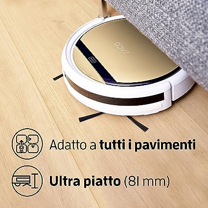 Aspirapolvere lavapavimenti robot fino a 180 m²: il ZACO V5s Pro ha una durata della batteria particolarmente lunga, fino a 120 minuti, con cui è possibile aspirare o pulire in modo affidabile anche grandi appartamenti con moquette, pavimenti duri e peli di animali domestici. Funzione di pulizia attiva: basta sostituire il serbatoio della polvere con il serbatoio dell'acqua, compreso il panno in microfibra, e avviare il robot lavapavimenti ZACO V5s Pro comodamente tramite il telecomando o il pulsante. Ideale per tutti i pavimenti duri come piastrelle o parquet. Per i peli di animali: grazie alla forte potenza di aspirazione e all'aspirazione diretta senza spazzole, i peli di animali domestici vengono aspirati in modo affidabile e non si avvolgono intorno alla spazzola. Il filtro per polveri sottili filtra anche gli escrementi degli acari e le polveri sottili dall'aria. Facile da usare: controllare il robot robot lavapavimenti e aspirapolvere semplicemente con il telecomando o con un pulsante. Sono disponibili 4 modalità di aspirazione, come la potente modalità MAX, e la funzione timer che consente di impostare comodamente il tempo di pulizia. Aspirapolvere robot piatto 8.1 cm e silenzioso con solo 60 dB | Ritorno automatico alla stazione di ricarica