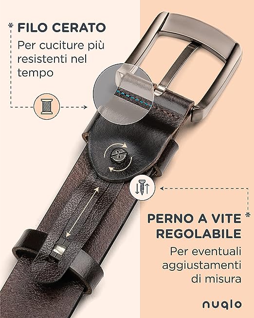 PELLE DI PRIMA SCELTA: Dalla concia dei pellami si ricavano diverse tipologie di pelle, che si distinguono in diversi gradi qualitativi. Noi utilizziamo solo il fiore della pelle, ovvero la parte più pregiata, quella che garantisce una maggiore resistenza e durevolezza del prodotto senza rinunciare alla finezza della grana della pelle. FIBBIA IN METALLO SPAZZOLATO: La fibbia in lega di zinco con lavorazione spazzolata resiste meglio ai graffi e alle ammaccature rispetto alle classiche fibbie di metallo in commercio. Il materiale che costituisce la fibbia delle cinture Nuqlo è