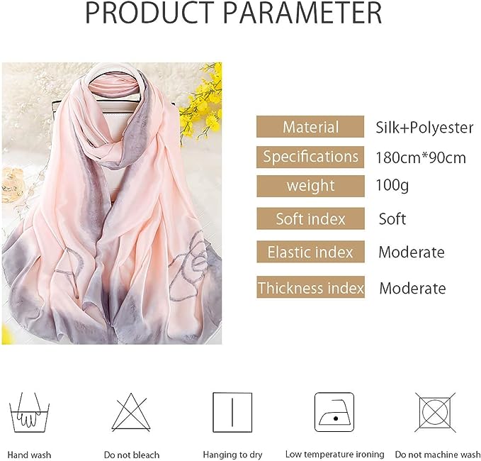 MODELLO SQUISITO:La pittura a inchiostro crea uno stile artistico unico.Le sciarpe sono disegnate dai nostri artisti secondo l'ultima tendenza della moda.Eccellente processo di stampa e tintura e buona solidità del colore.Controlla rigorosamente la tecnologia di tessitura per garantire una buona qualità. MORBIDA SETA NATURALE:I tessuti di seta di gelso sono morbidi, leggeri e liscio.La seta non ha solo una lucentezza sottile, ma non irrita la pelle.Il tessuto caldo e traspirante delle nostre sciarpe ti regalano un'esperienza davvero confortevole. Seta+Poliestere Non lavabile in lavatrice