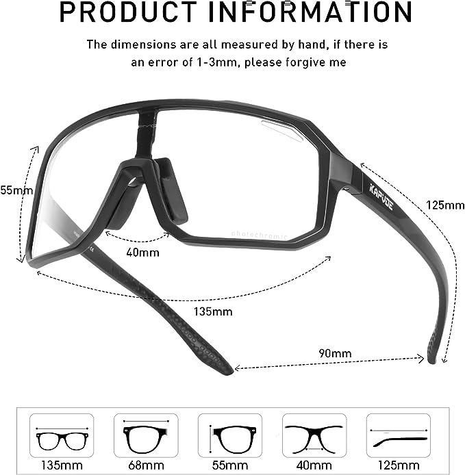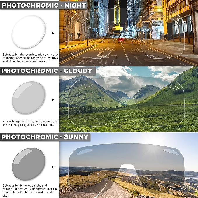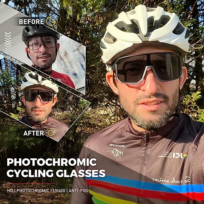 Spesso le lenti PC con un rivestimento idrofobico per aumentare la visibilità, resistente agli urti e anti-graffio in modo efficace. Gli occhiali KAPVOE MTB sono realizzati con tecnologia antiappannante per offrire un campo visivo chiaro in tutte le condizioni. Gli occhiali da sole fotocromatici si scuriscono e si schiariscono in base alle condizioni di luce, passando da chiari a grigi sotto la luce del sole, proteggendo efficacemente i tuoi occhi offrendo al tempo stesso un'esperienza di visione confortevole. Non c'è bisogno di cambiare gli occhiali. Questi occhiali da mountain bike fotocromatici sono dotati di naso morbido in gomma e montatura TR90 flessibile che offrono comfort e possono adattarsi a diversi tipi di viso. Il design dell'ingresso d'aria sulla lente evita la condensazione, riduce la resistenza, aumenta il comfort di guida e è adatto per la guida ad alta velocità. Include un telaio per miopi nel pacchetto degli occhiali da ciclismo, comodo per configurare le lenti. Gli occhiali da sole sportivi KAPVOE possono essere utilizzati per molte attività, come il golf, il baseball, il ciclismo, la guida, la pesca, lo sci, la corsa, la navigazione e altre attività.