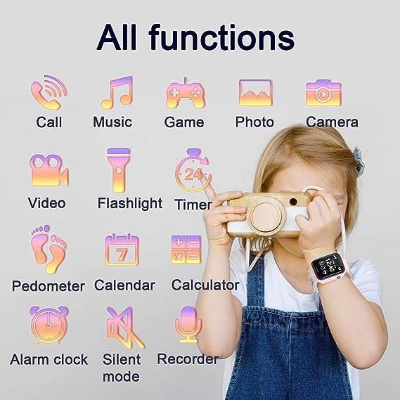 Con il nuovo design del classico orologio intelligente abbiamo lo schermo HD da 1,54 pollici, il braccialetto è realizzato in materiale confortevole, quindi è più morbido e comodo da indossare. L'orologio intelligente per bambini avanzato per ragazzi e ragazze ha molte funzioni come: Chiama / SOS / Contapassi / Giochi / Musica / Video / Calcolatrice / Calendario / Sfondo / Modalità scuola / Cambia lingua / Torcia elettrica, ecc. Questo orologio intelligente per bambini ha l'ultima fotocamera aggiornata (Luminosità regolabile, ha adesivi fotografici) Sfondo personalizzato, contapassi e funzione di registrazione video. I bambini possono scattare foto in qualsiasi momento e allo stesso tempo impostare le loro immagini preferite come sfondo. I bei momenti dei bambini possono essere registrati in qualsiasi momento. L'orologio contiene 7 giochi con una bellissima immagine ad alta risoluzione che è più divertente per i bambini. Con la funzione Musica puoi scaricare musica MP3 dal tuo computer e salvarla in