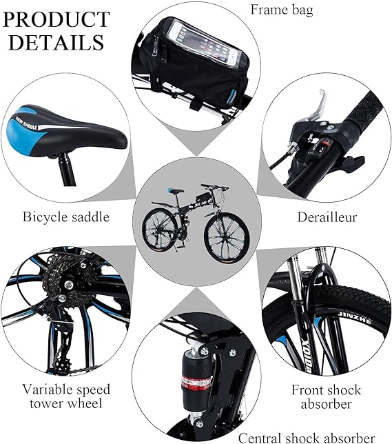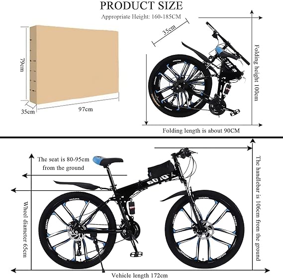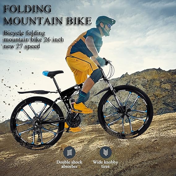Cerchi da 26 pollici, eleganti e sicuri. Gli pneumatici da montagna con ampio grip All-Terrain sono montati su cerchi in lega leggera e durevole per aumentare la stabilità.Molto adatta per i viaggi all'aria aperta, le escursioni nella natura selvaggia e puoi anche andare a lavoro o a scuola. Grazie all'eccellente potenza del sistema di propulsione microNEW è possibile cambiare facilmente e in modo sicuro tra 27 marce - a mountain bike in fibra di carbonio ha un telaio in acciaio robusto e resistente, in modo da poter utilizzare la bicicletta in ogni situazione. Grazie alla sua qualità robusta, la bicicletta può sopportare un carico di 150 kg - Si piega in pochi secondi senza attrezzi, riduce al minimo il volume del veicolo ed è facile da riporre; può essere inserita nel bagagliaio per viaggiare con voi; si può anche portare in ascensore - Il doppio freno a disco, migliora efficacemente l'efficacia di frenata e assicura una frenata sicura anche nei giorni di pioggia; design antiscivolo e resistente all'usura, ogni piccolo dente è ottimizzato per ottenere una migliore presa e adattarsi a diversi terreni complessi
