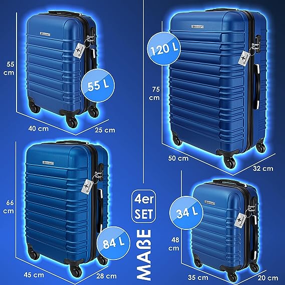 Le valigie hanno un robusto guscio rigido ABS, che è resistente agli urti e ai graffi. Guscio rigido in plastica ABS flessibile - Quando non usi le valigie, puoi facilmente riporre tutte le misure S, M, L e XL una dentro l'altra. Ogni valigia è dotata di un manico telescopico regolabile in altezza, 4 rotelle di plastica girevoli a 360Ḟ e le tre misure possono essere riposte l'una dentro l'altra con il minimo ingombro. Set di 4 valigie Misure: S da 34L M da 55L L da 84L e XL da 120L possono essere riposte una dentro l'altra. Ogni valigia ha un lucchetto con combinazione incorporato, in cui è possibile inserire e bloccare i tirazip. In questo modo, nessuno potrà aprire la valigia senza conoscere la combinazione e il tuo contenuto sarà sempre al sicuro. Lucchetto con combinazione integrato
