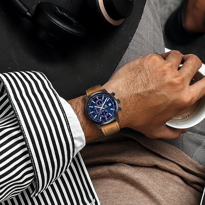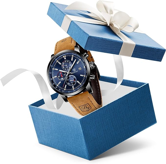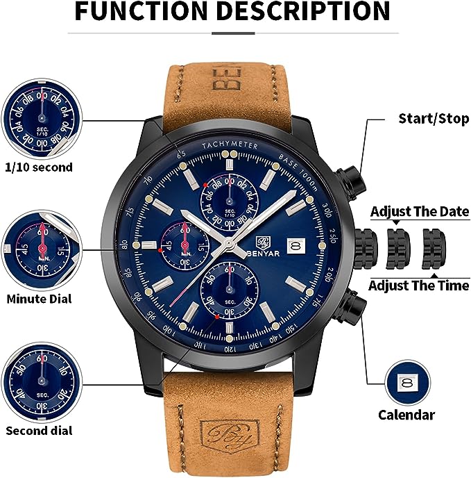 Design elegante: BY BENYAR offre una gamma di orologi eleganti e minimalisti progettati per gli uomini. BY-5102 è un orologio rotondo classico, casual e sobrio, non puoi sbagliare! L'orologio non è solo pratico, ma ha anche valore artistico! Qualità premium: questo orologio è dotato di vetro resistente al 100%, quadranti multifunzione e cassa in acciaio inossidabile. Il movimento al quarzo di alta qualità e la batteria forniscono un'accurata misurazione del tempo. Il quadrante cronografo multifunzione controlla l'ora al minuto, il secondo, il decimo di secondo! Impermeabile e cinghia: impermeabile fino a 30 metri. Resiste a sudore, pioggia accidentale o spruzzi d'acqua. Viene fornito con un cinturino in pelle marrone per una maggiore morbidezza, comfort ed eleganza