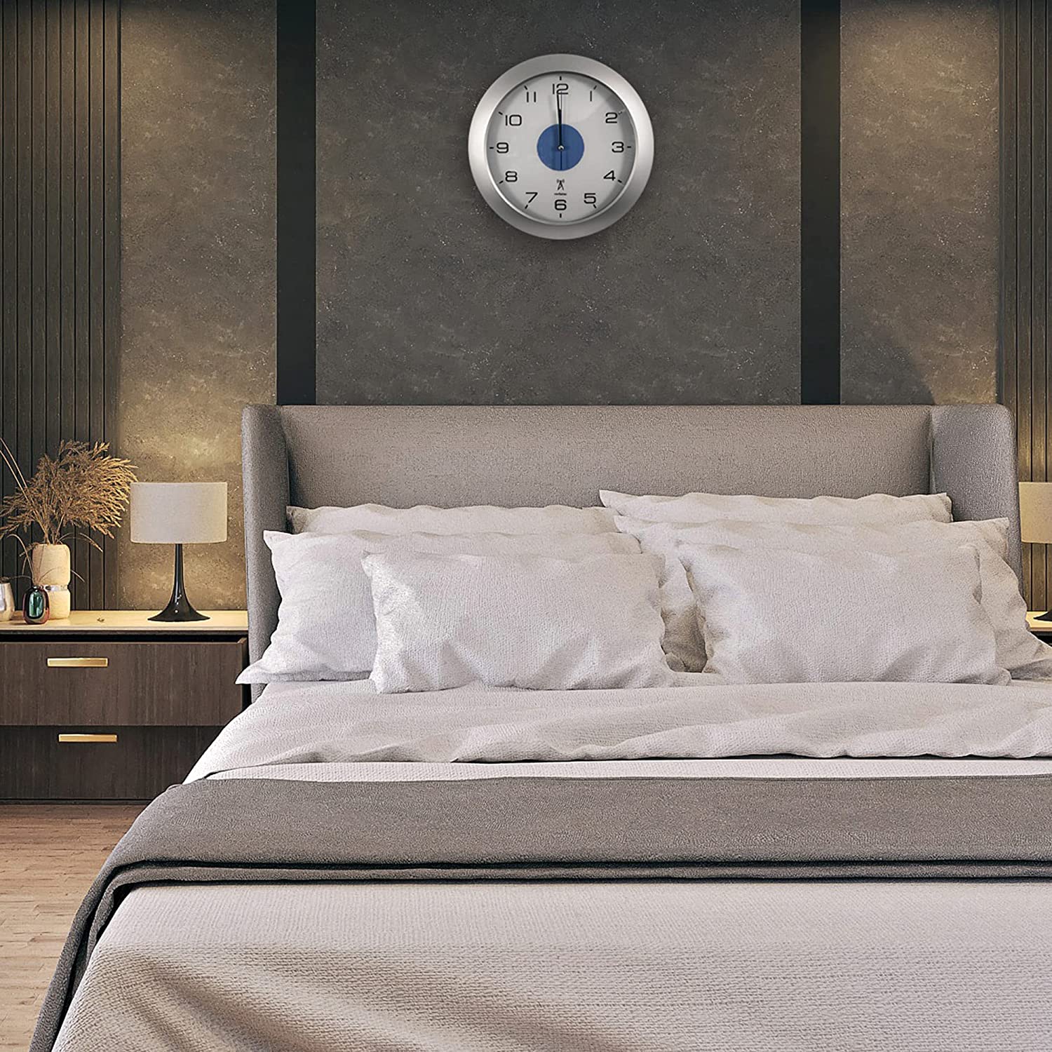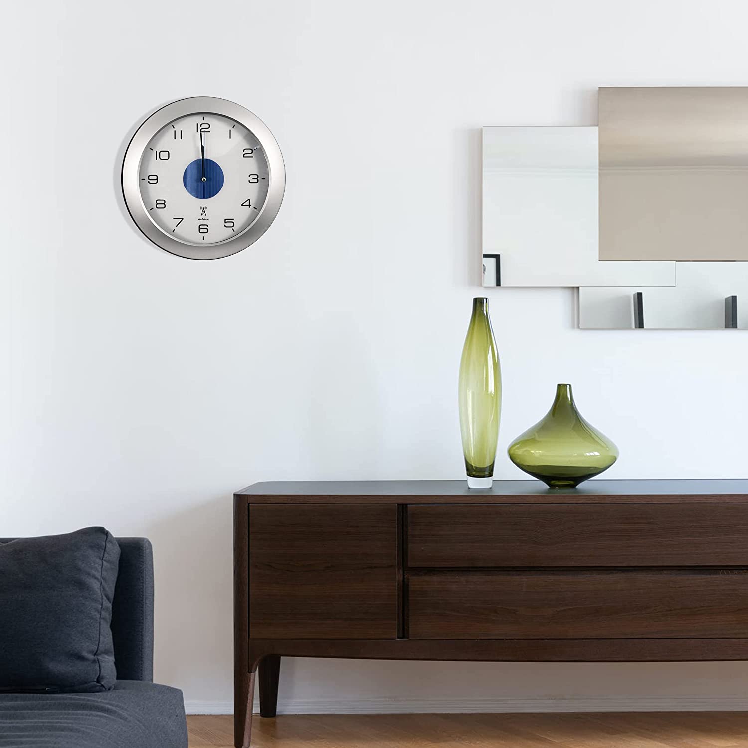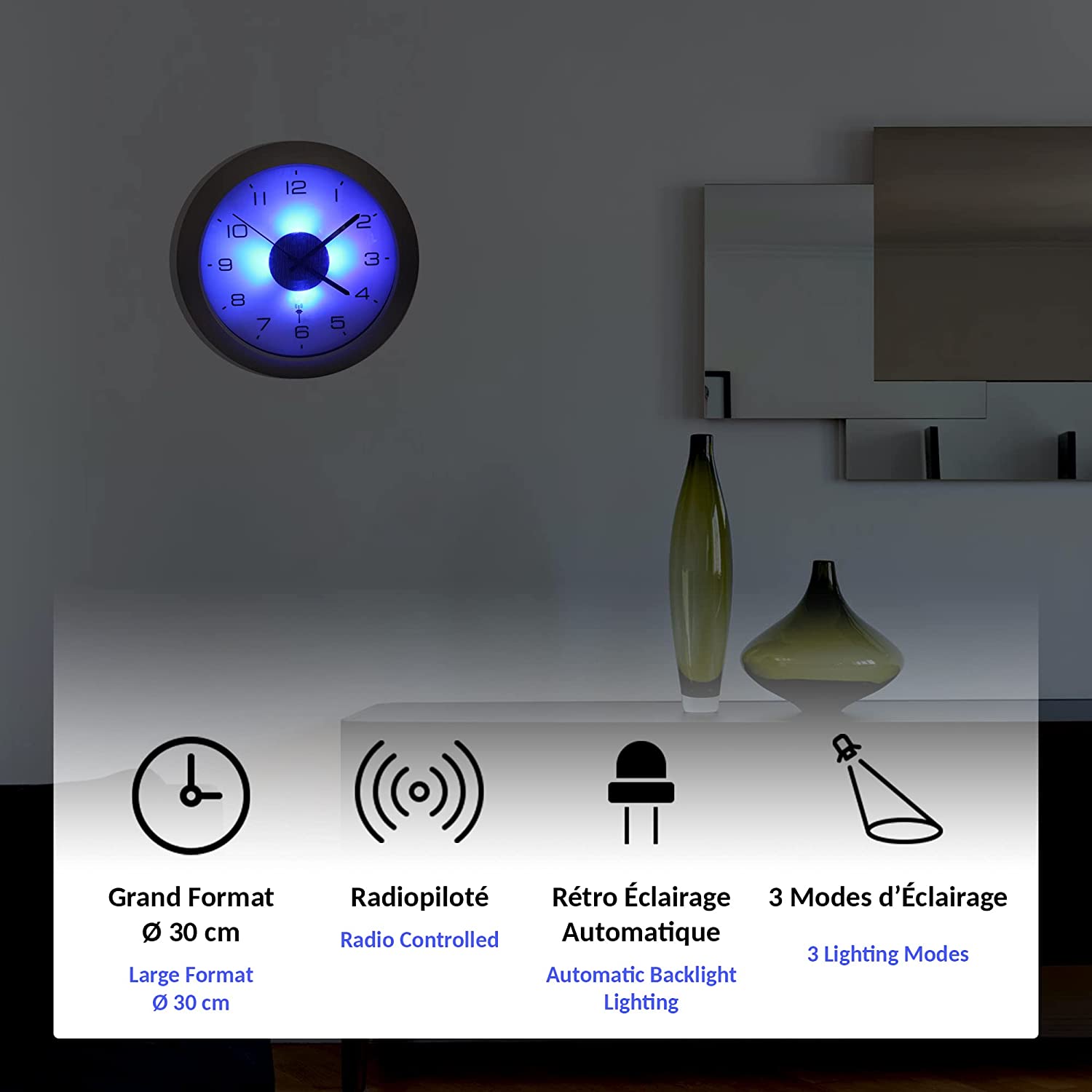 OROLOGIO DA PARETE LUMINOSO - I 4 LED nascosti all'interno illuminano i numeri dopo il tramonto. La morbida luce blu che emana l'orologio è piacevole e facilita la lettura dell'ora - MODALITÀ - È possibile scegliere tra 3 modalità in base alle proprie esigenze: 1 - Accende automaticamente i LED in caso di buio / 2 - Accende i LED continuamente / 3 - Spegne i LED. MODERNO - Il grande orologio da parete (Ø 30cm) è perfetto per la tua decorazione d'interni. Un oggetto di design che troverà facilmente il suo posto nella tua casa: soggiorno, cucina o camera da letto. Potrai anche posizionarlo in un'aula o in un ufficio. Radiocomandato - L'orologio si regola da solo e sarà sempre impostato sull'ora corretta. Effettua autonomamente i cambi di orario estate/inverno, senza bisogno di toglierlo dal muro. Segnale RCC da Francoforte (DE - CARATTERISTICHE - Materiali: ABS, plastica - Alimentazione: 4 batterie AA (non incluse) - Dimensioni: 30 x 5,5 cm - Certificato CE, RoHS, RED